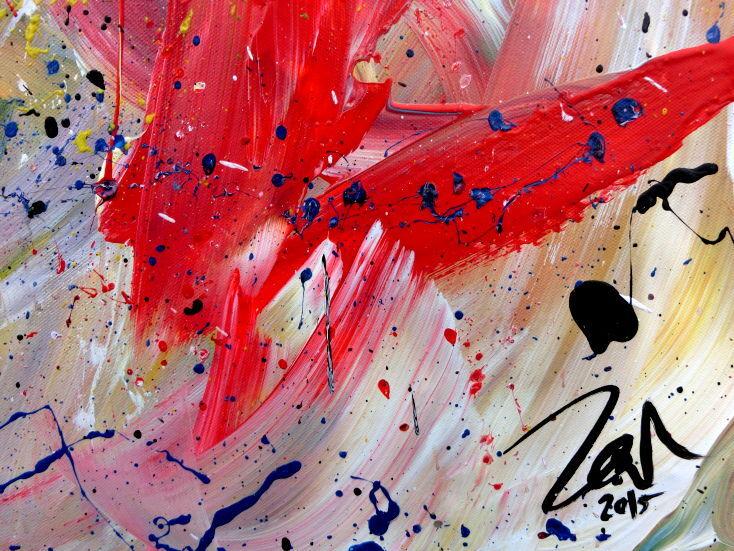 Dieses abstrakte Acrylbild ist ein handgemaltes Original vom Künstler Alex Zerr aus Bad Lisppringe und ist im Jahr 2015 in seinem Atelier entstanden. Das Bild hat eine Größe von 150x200cm und ist bereits auf einem hochwertigen und stabilem Rahmen aufgespannt. Dadurch kann das Bild nach der Lieferung direkt an die Wand gehängt werden und sofort in Ihrem Raum wirken. Alle Seiten des Gemäldes sind passend zum Motiv bemalt, so dass kein zusätzlicher Rahmen benötigt wird.