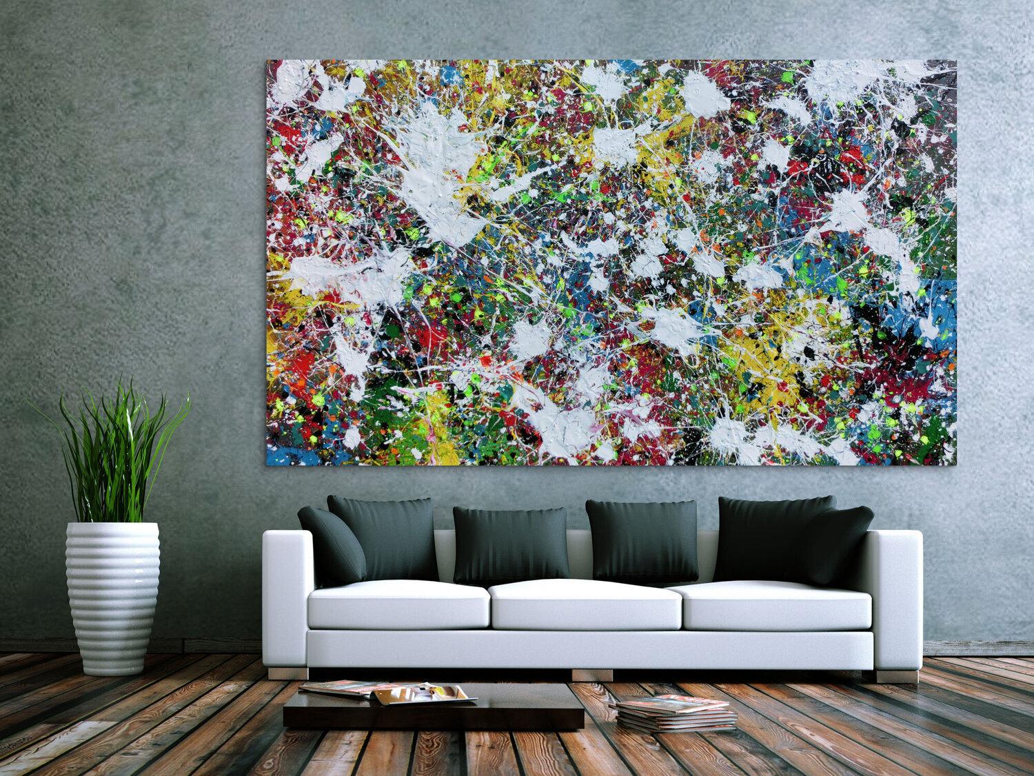 Abstraktes Gemälde auf Leinwand Buntes Abstraktes Acrylbild Action Painting viele Flecken auf Leinwand sehr modern in 140x240cm von Alex Zerr