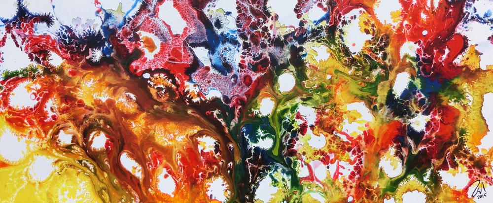 Dieses abstrakte Acrylbild ist ein handgemaltes Original vom Künstler Alex Zerr aus Bad Lisppringe und ist im Jahr 2015 in seinem Atelier entstanden. Das Bild hat eine Größe von 60x150cm und ist bereits auf einem hochwertigen und stabilem Rahmen aufgespannt. Dadurch kann das Bild nach der Lieferung direkt an die Wand gehängt werden und sofort in Ihrem Raum wirken. Alle Seiten des Gemäldes sind passend zum Motiv bemalt, so dass kein zusätzlicher Rahmen benötigt wird.