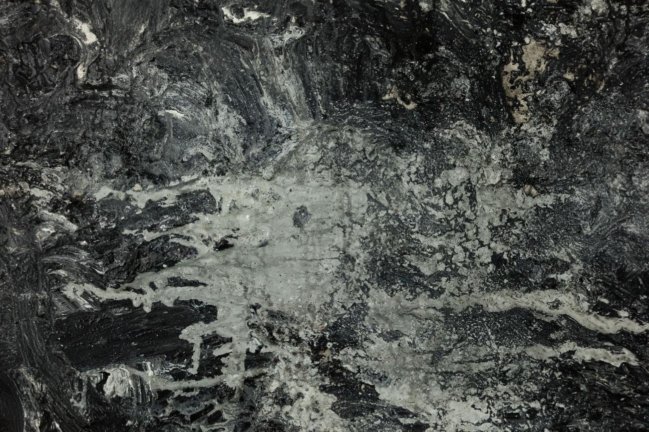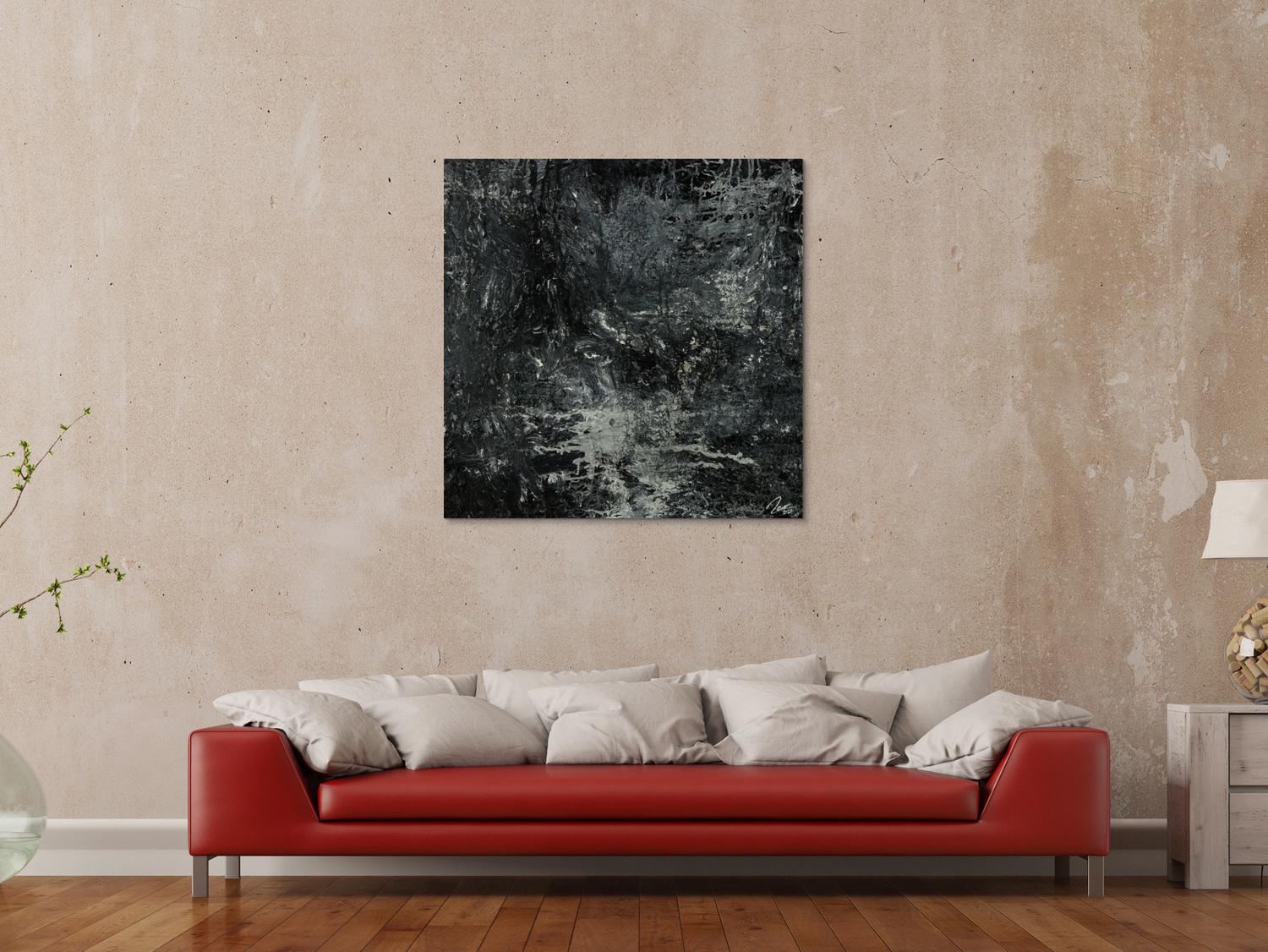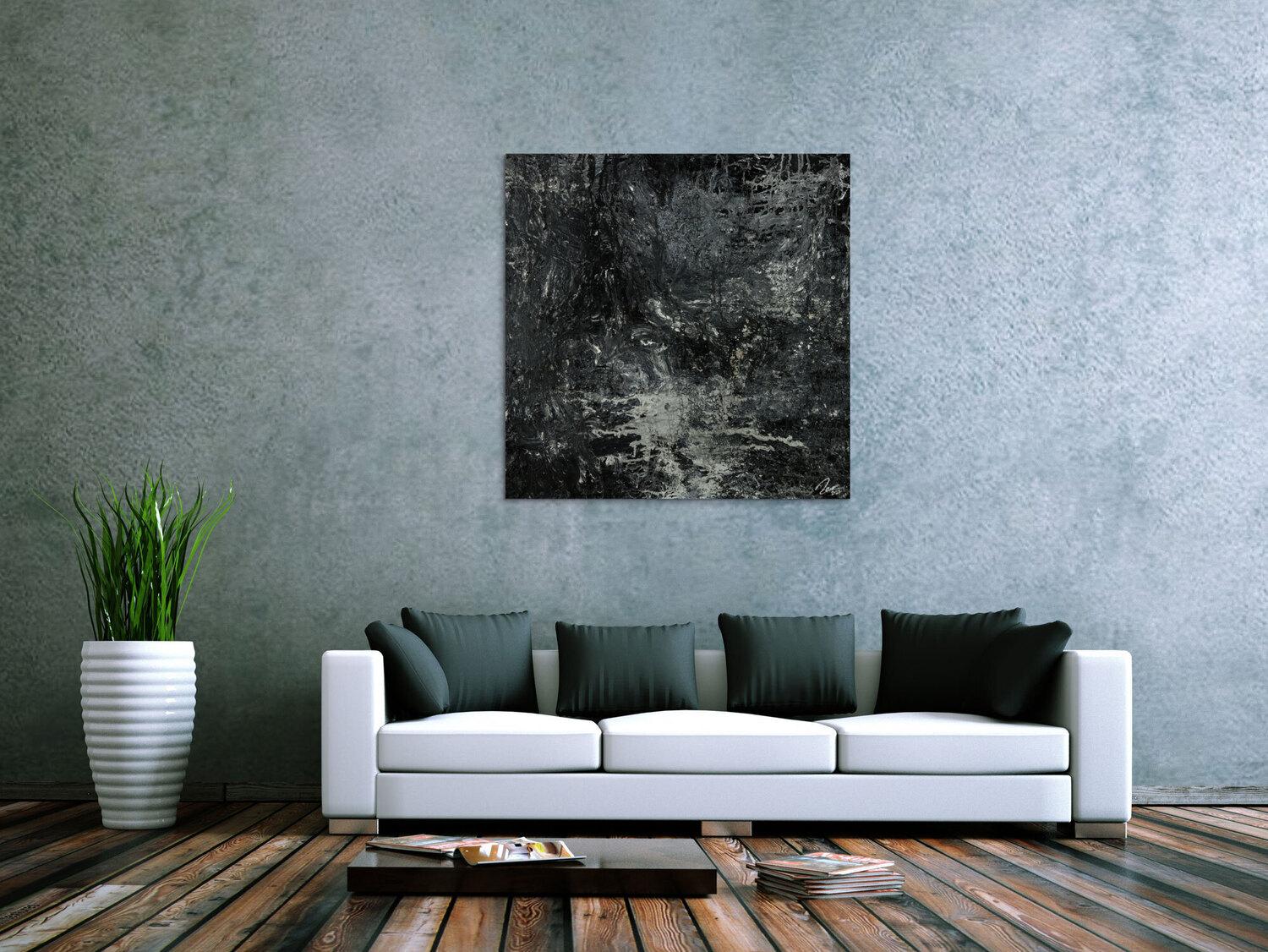 Abstraktes Gemälde auf Leinwand Gemälde Original abstrakt 100x100cm Minimalistisch Modern Art handgemalt Action Painting schwarz anthrazit einzigartig in 100x100cm von Alex Zerr