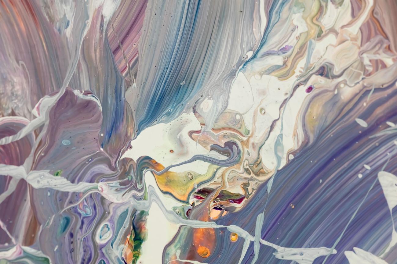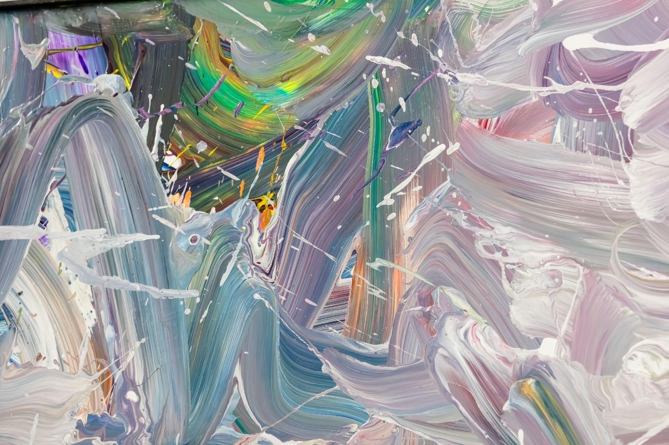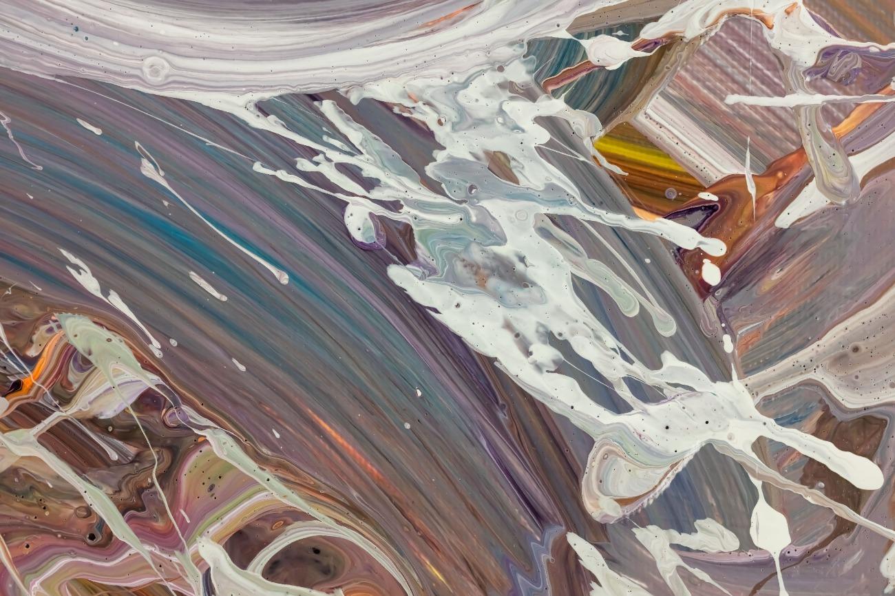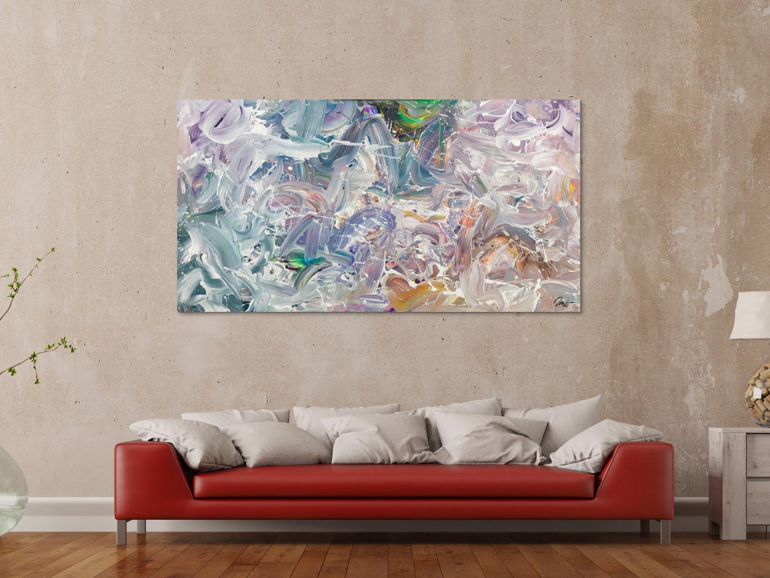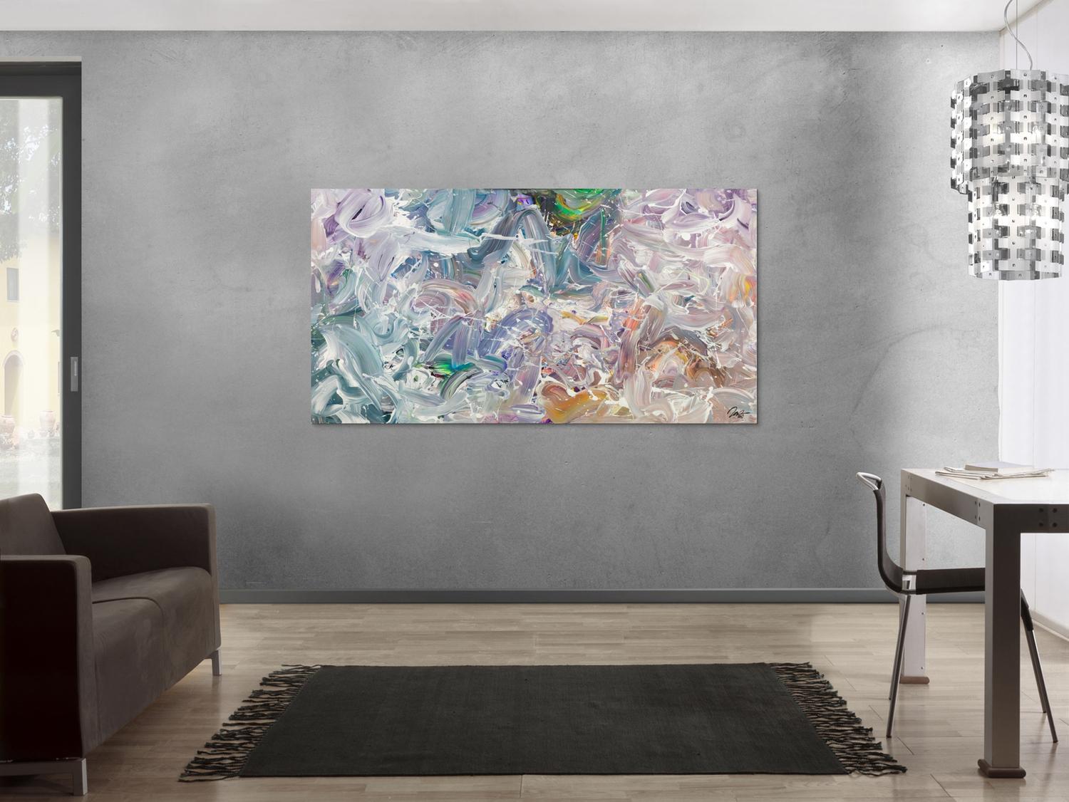 Abstraktes Gemälde auf Leinwand Gemälde Original abstrakt 100x180cm Mischtechnik expressionistisch handgemalt Fluid Painting weiß flieder türkis Unikat in 100x180cm von Alex Zerr