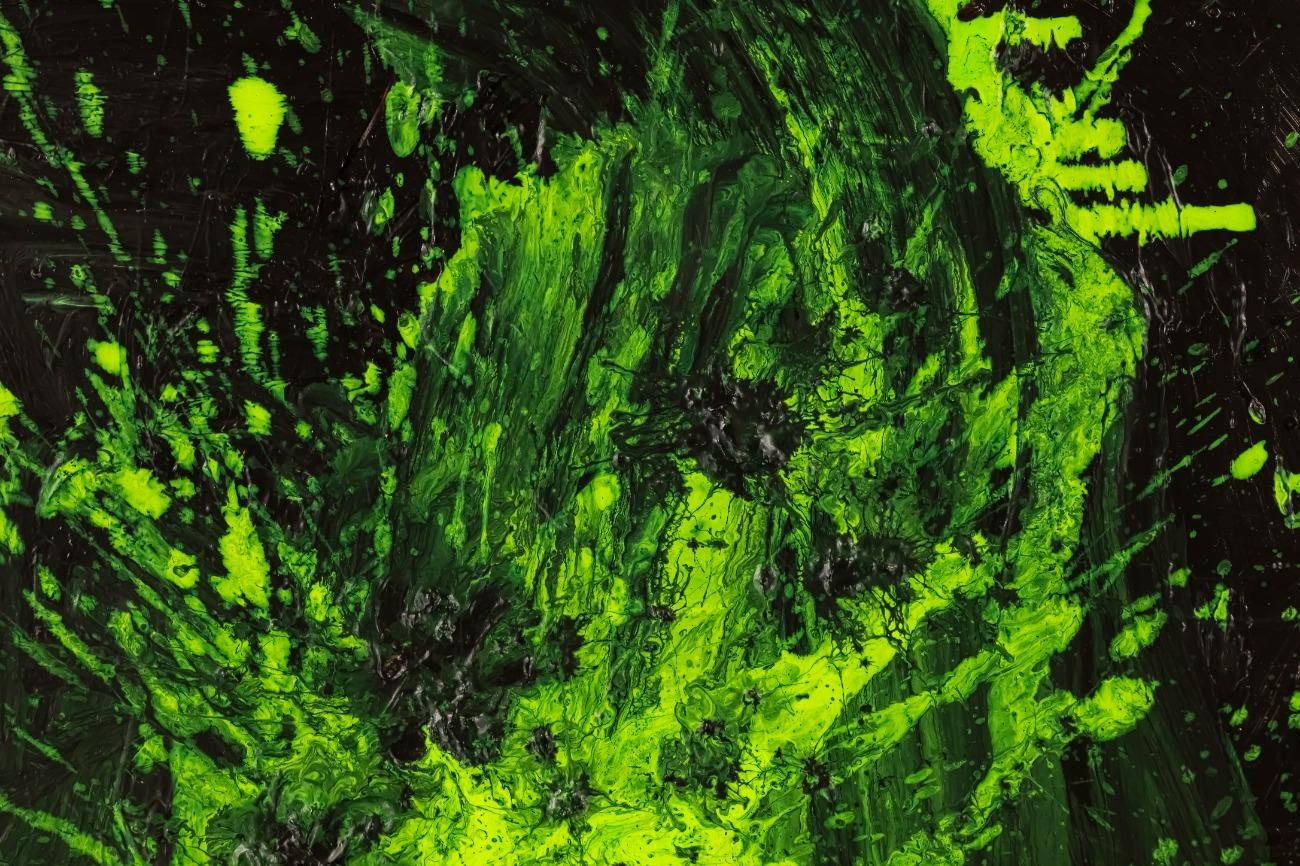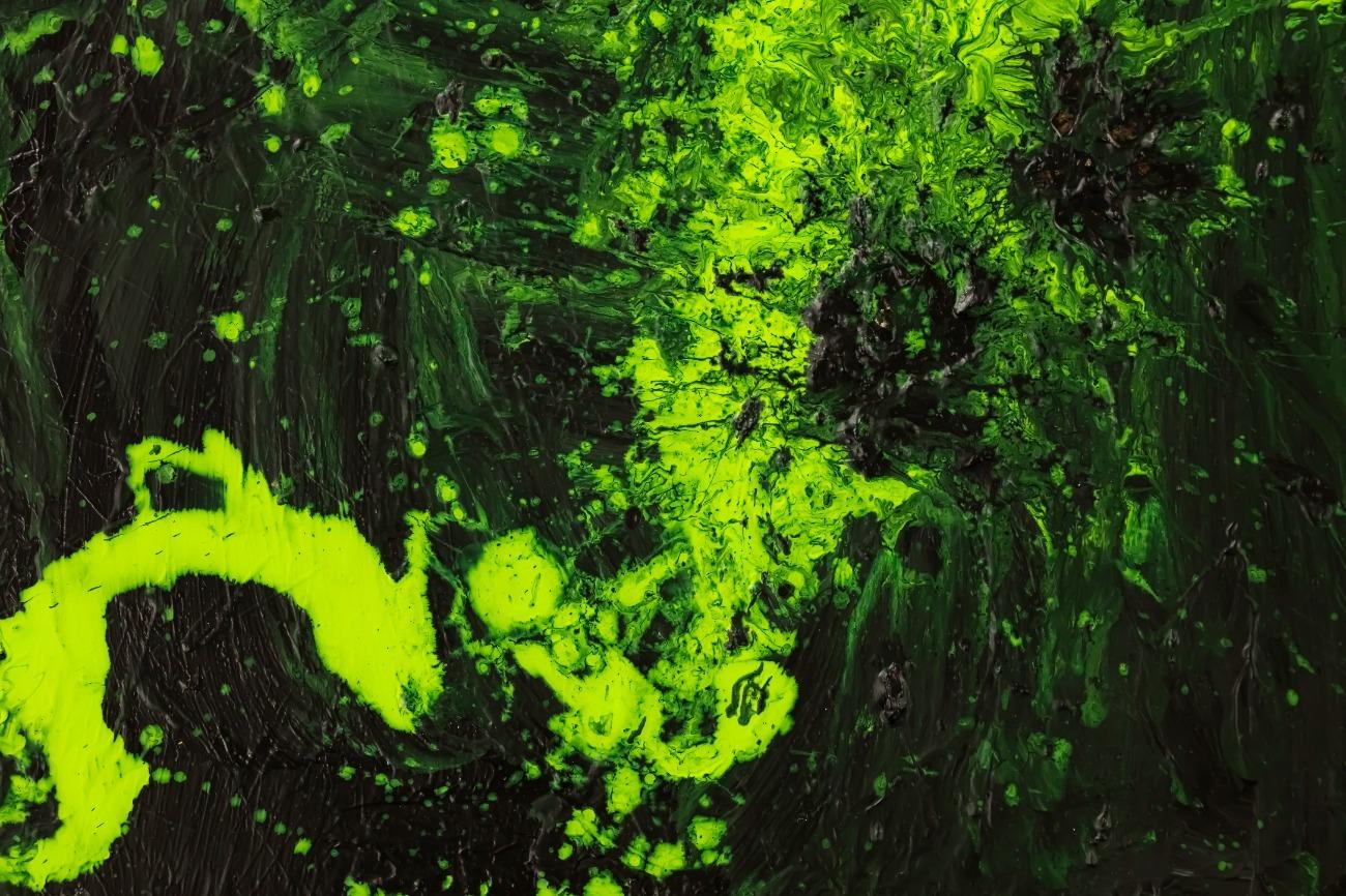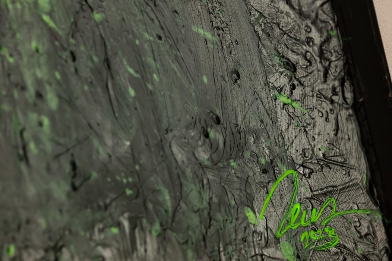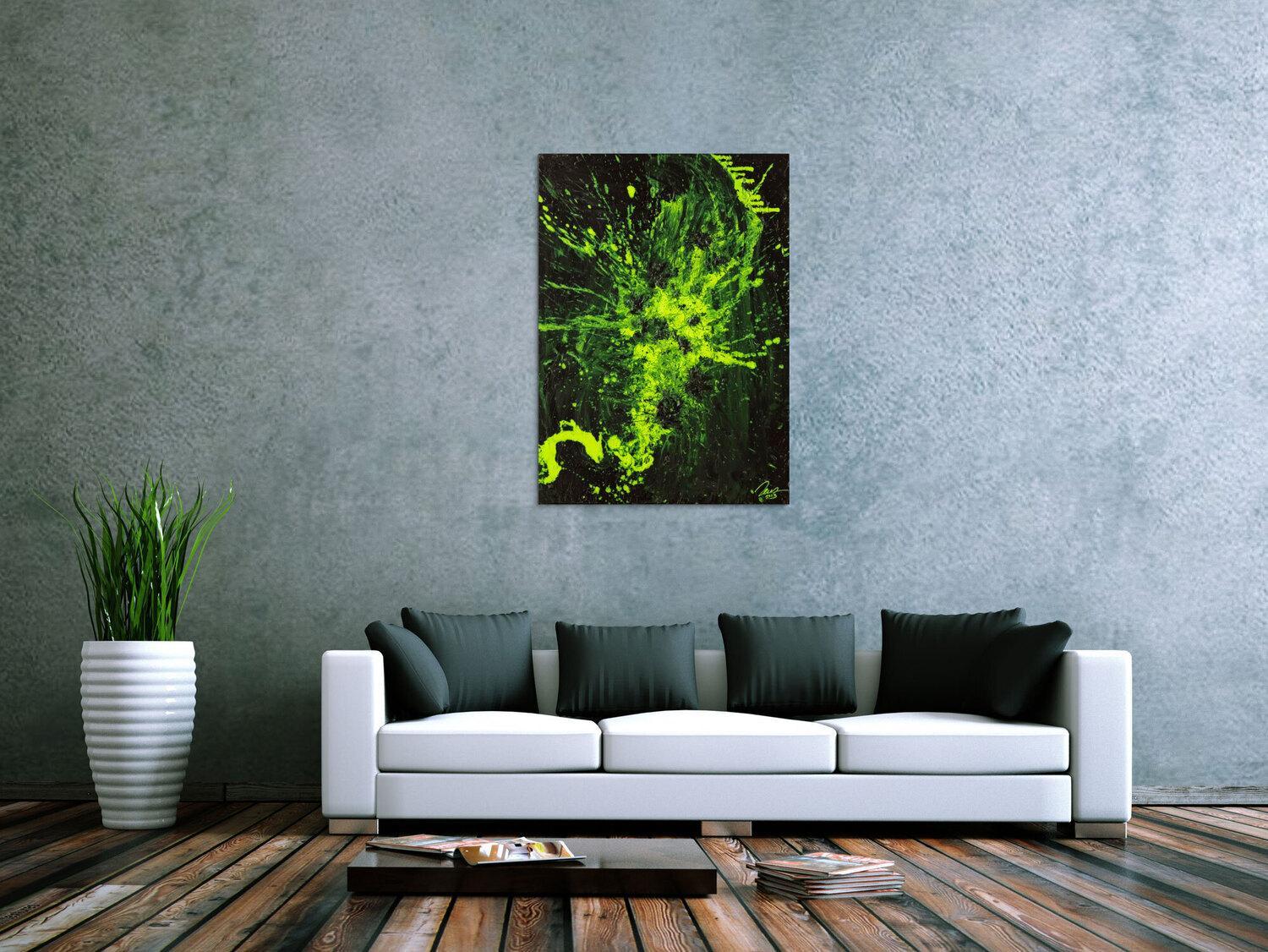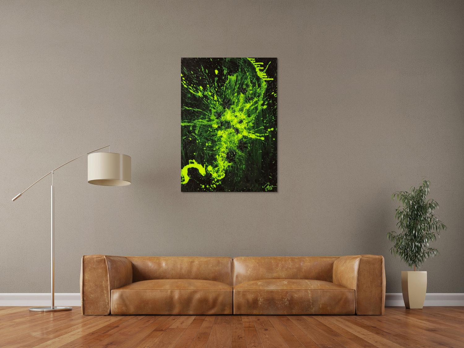 Gemälde Original abstrakt 100x72cm Action Painting Modern Art auf Leinwand Mischtechnik schwarz NEON grün hellgrün Einzelstück