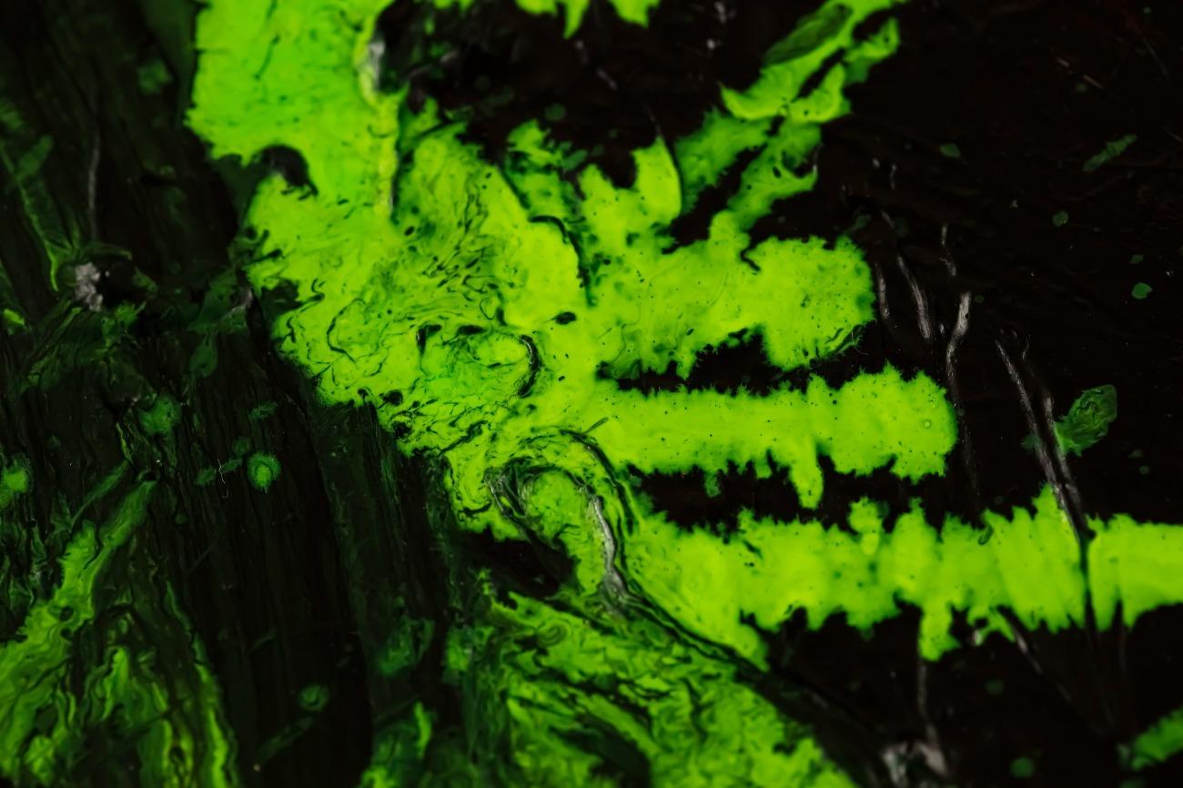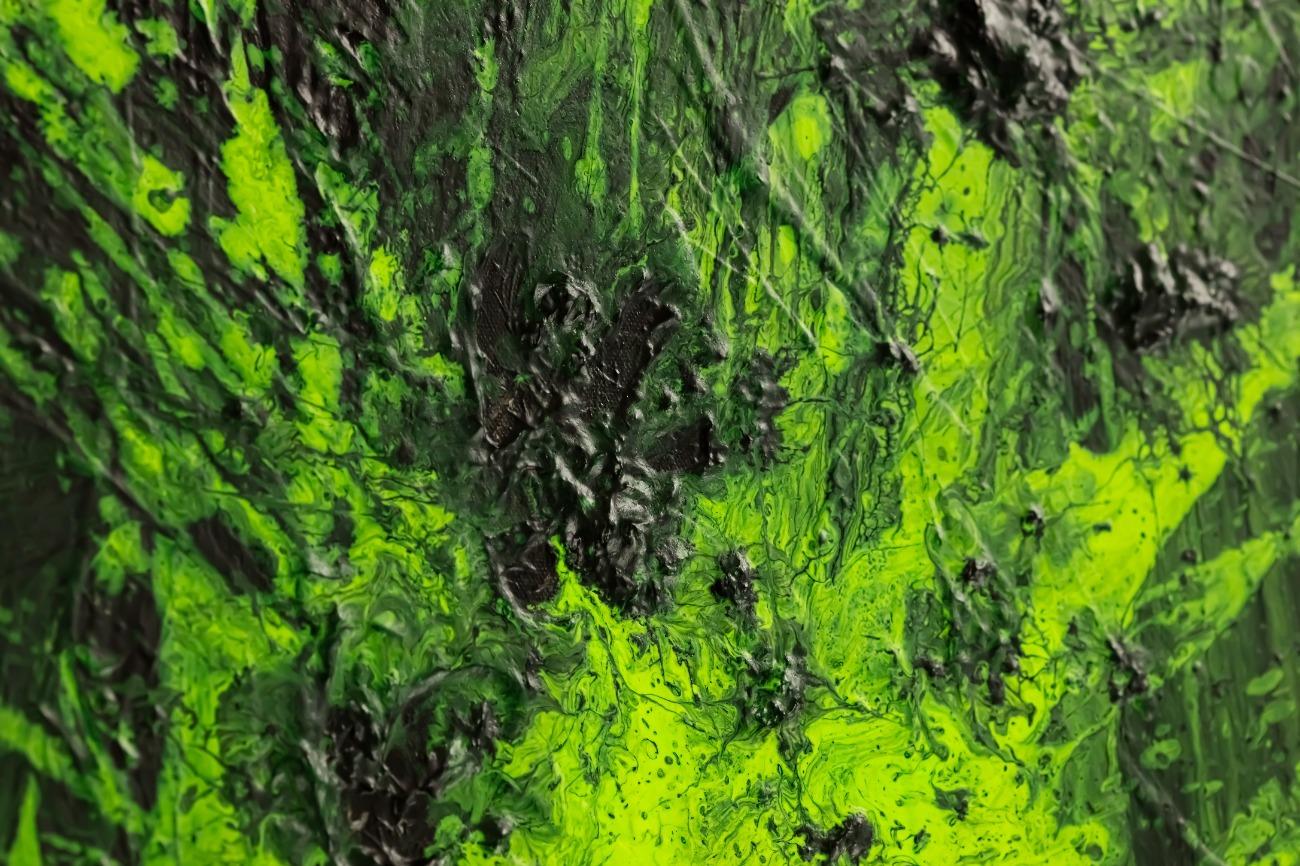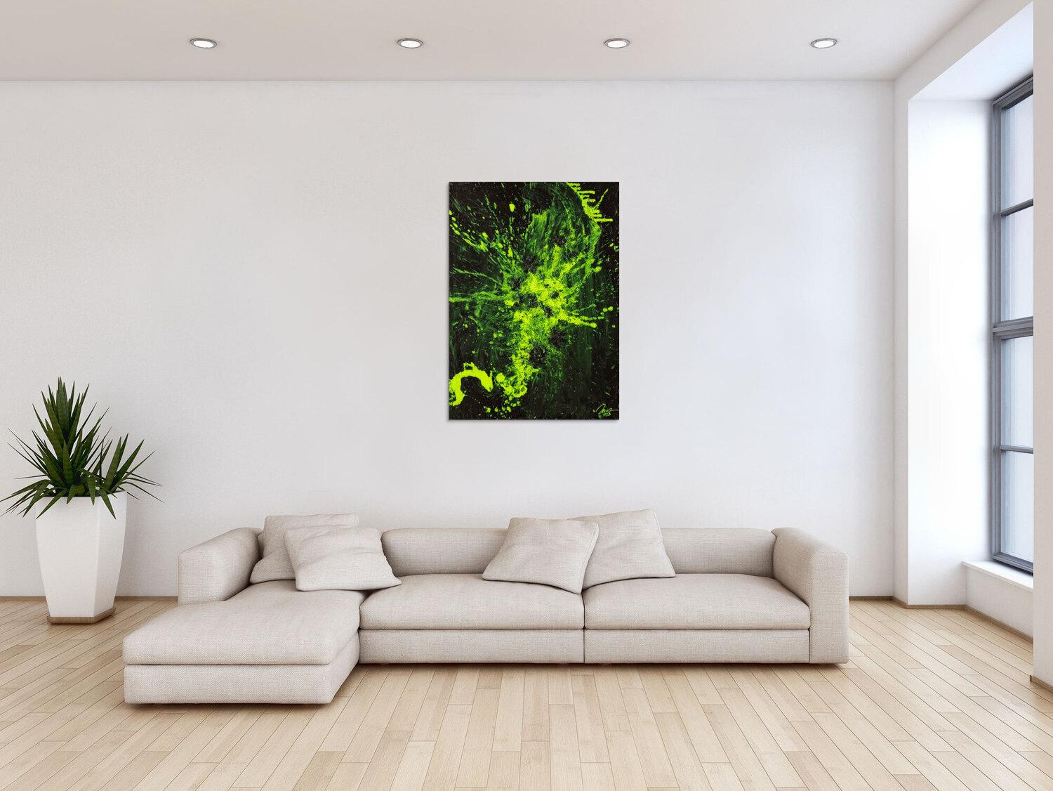 Abstraktes Gemälde auf Leinwand Gemälde Original abstrakt 100x72cm Action Painting Modern Art auf Leinwand Mischtechnik schwarz NEON grün hellgrün Einzelstück in 100x72cm von Alex Zerr