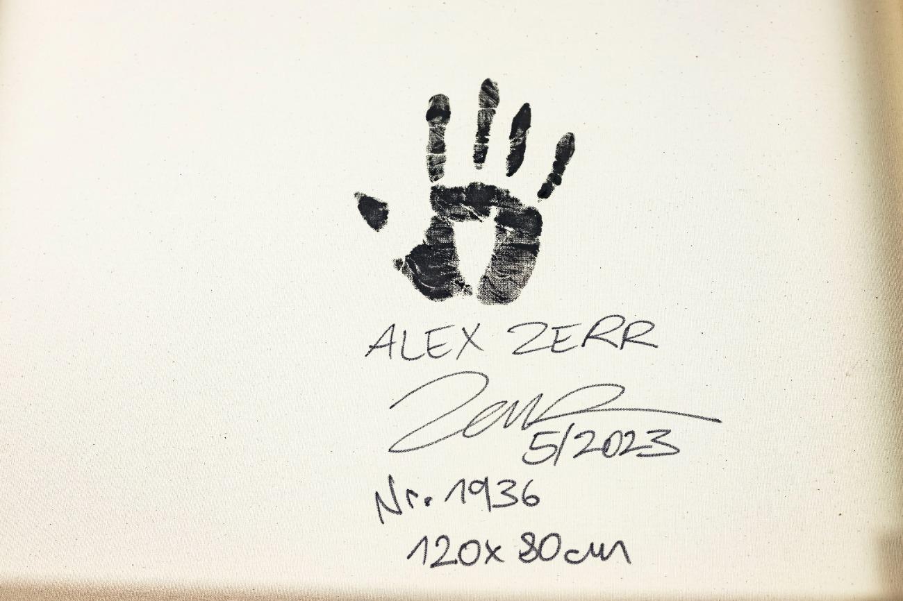 Das Bild ist vom Künster Alex Zerr auf der Vorderseite signiert ggf. ist auf der Rückseite des Bildes der Handabdruck des Künstlers zu finden. Dadurch erhält das Bild ein nicht zu kopierendes und persönliches "Siegel", wodurch Ihnen die Echtheit garantiert wird.