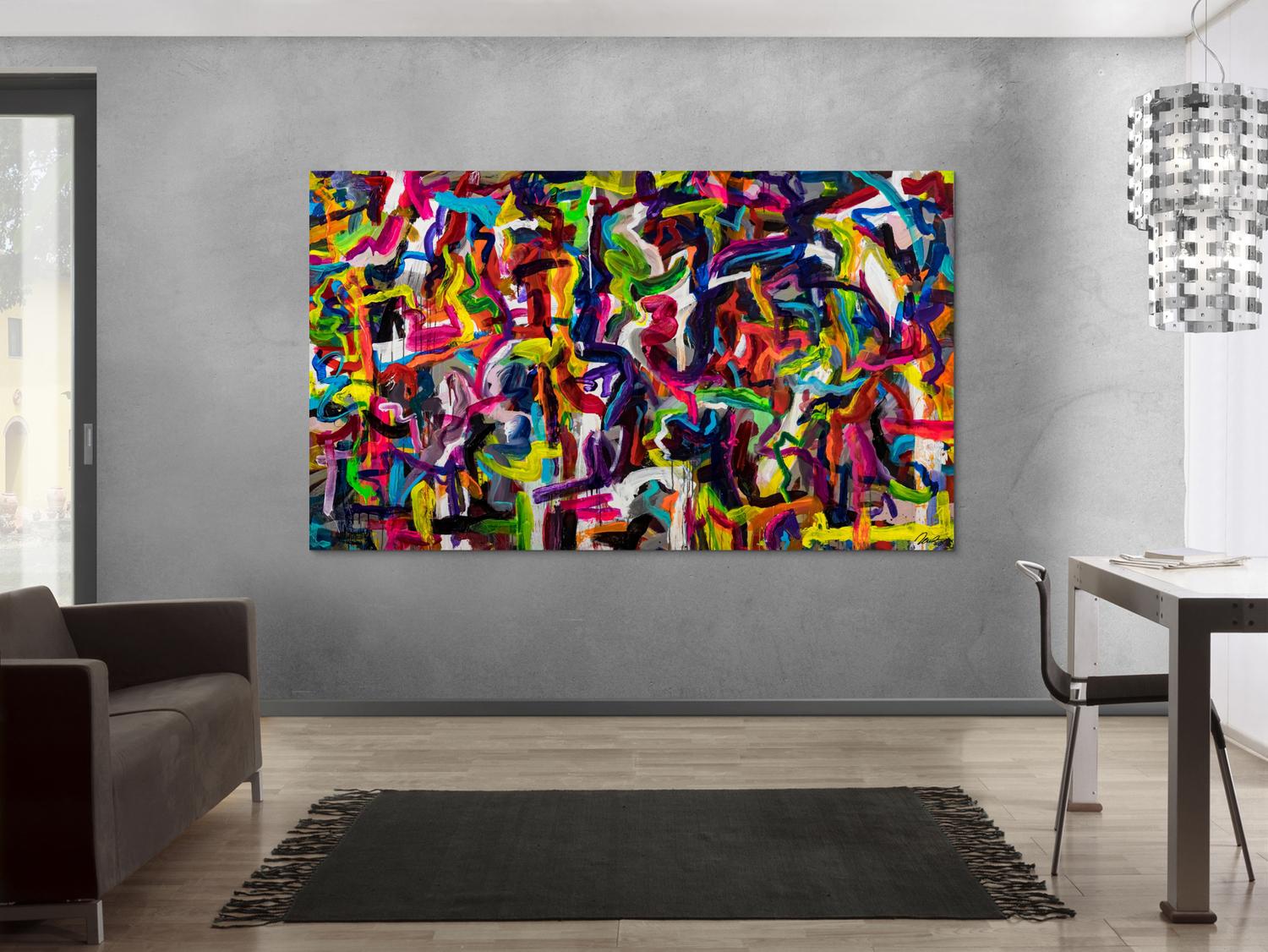 Das Bild hat die Beschreibung "Gemälde Original abstrakt 130x220cm Mischtechnik Moderne Kunst handgemalt Mischtechnik bunt schwarz rot Einzelstück" und der der durch den Künstler vergebene Titel ist: "Ohne Titel" - Abstraktes Acrylbild Nr. 1942.