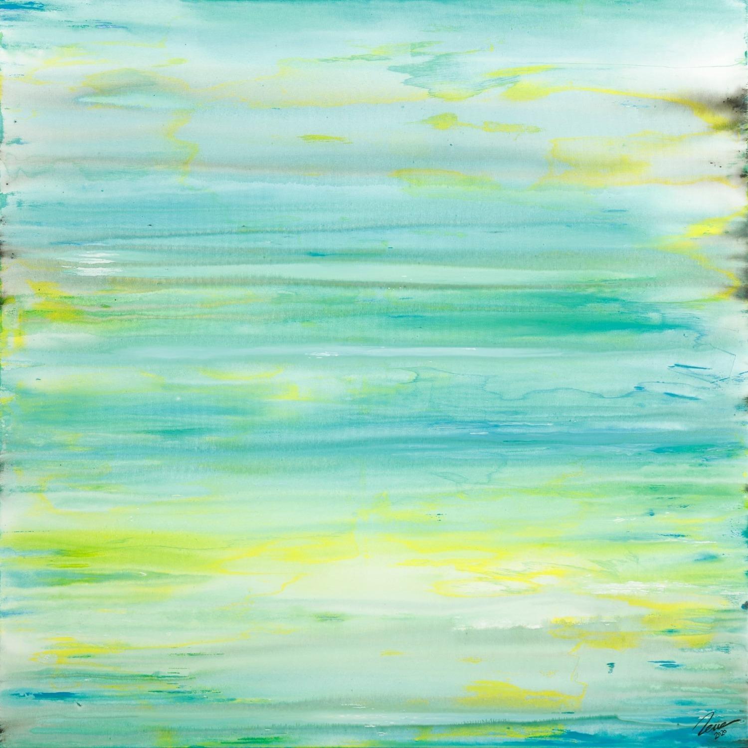 Abstraktes Gemälde auf Leinwand Gemälde Original abstrakt 140x140cm Mischtechnik Moderne Kunst auf Leinwand Fluid Painting weiß türkis beige Einzelstück in 140x140cm von Alex Zerr