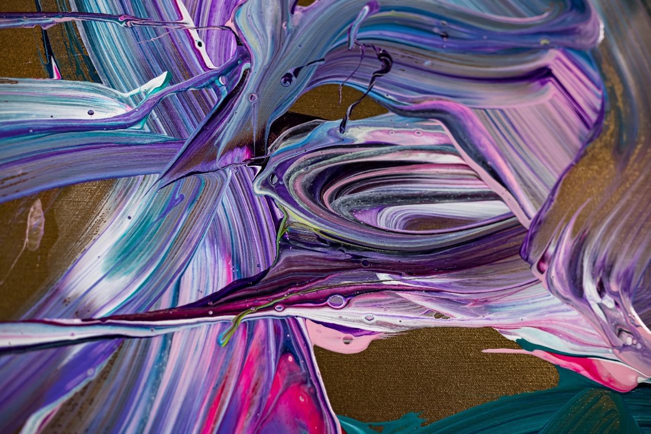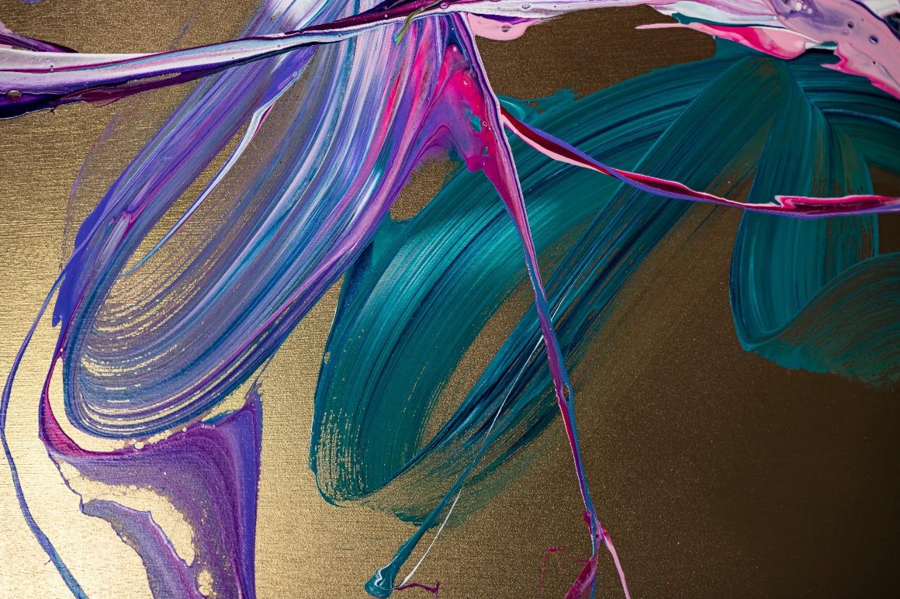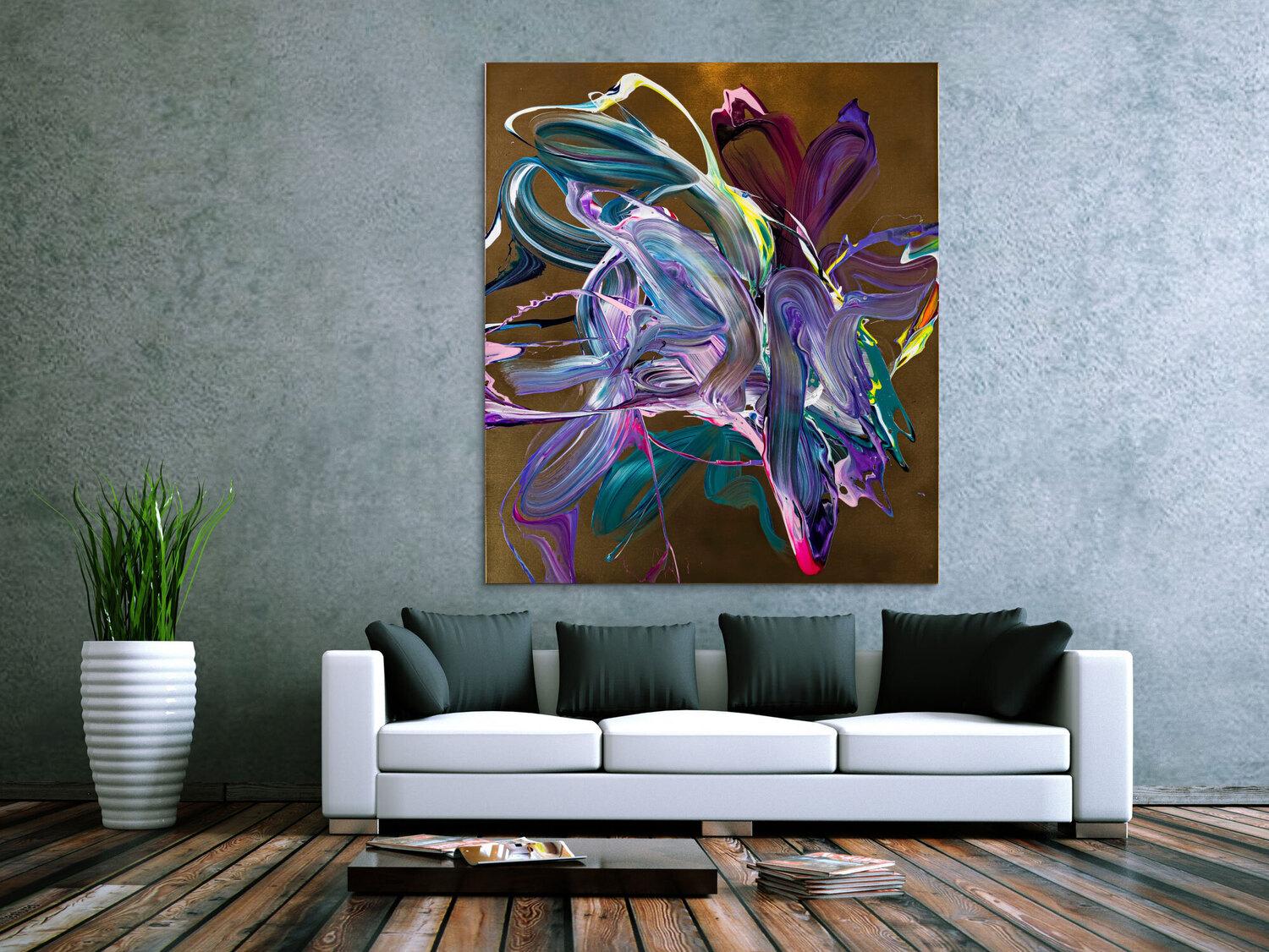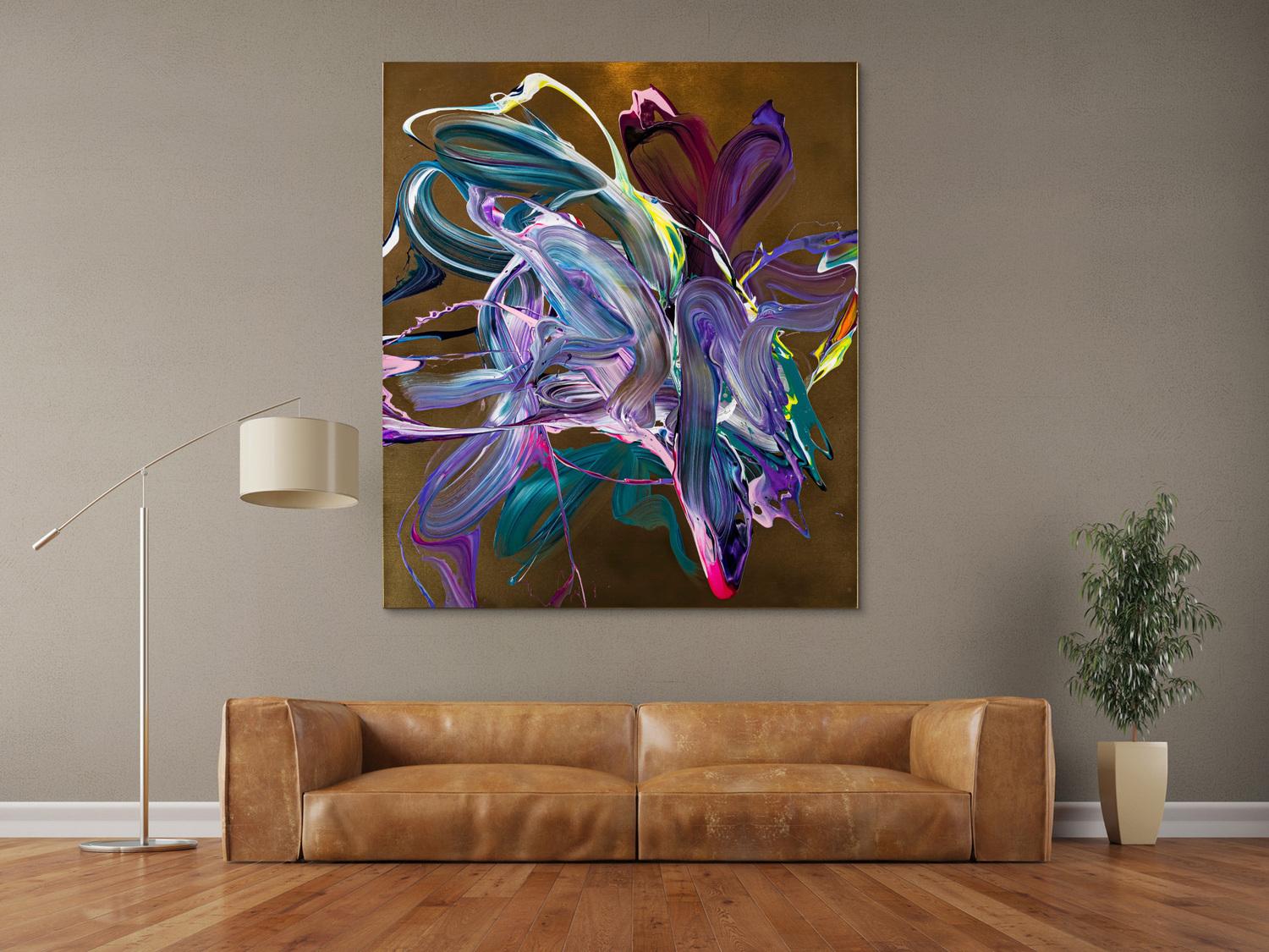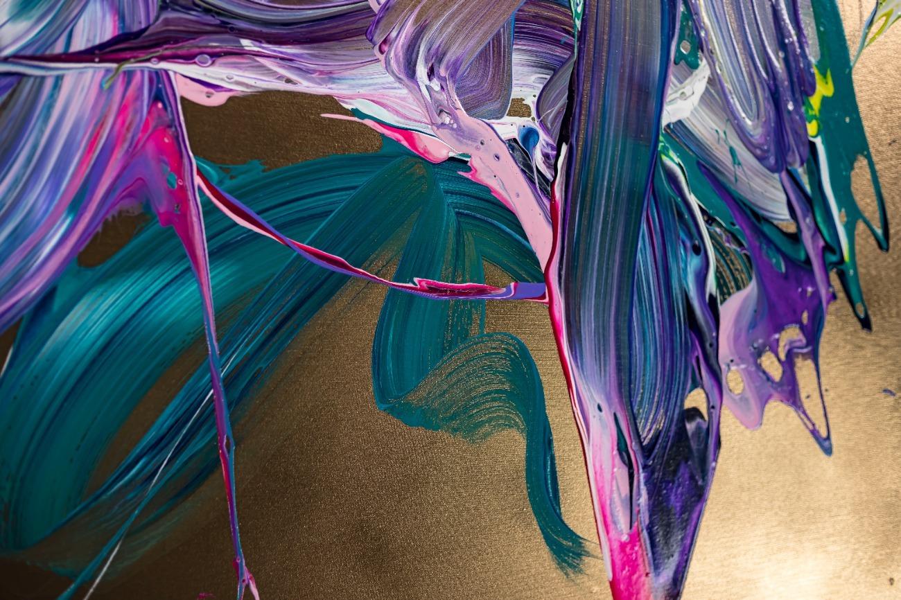 Gemälde Original abstrakt 150x130cm Action Painting Moderne Kunst handgefertigt Mischtechnik gold violett rosa