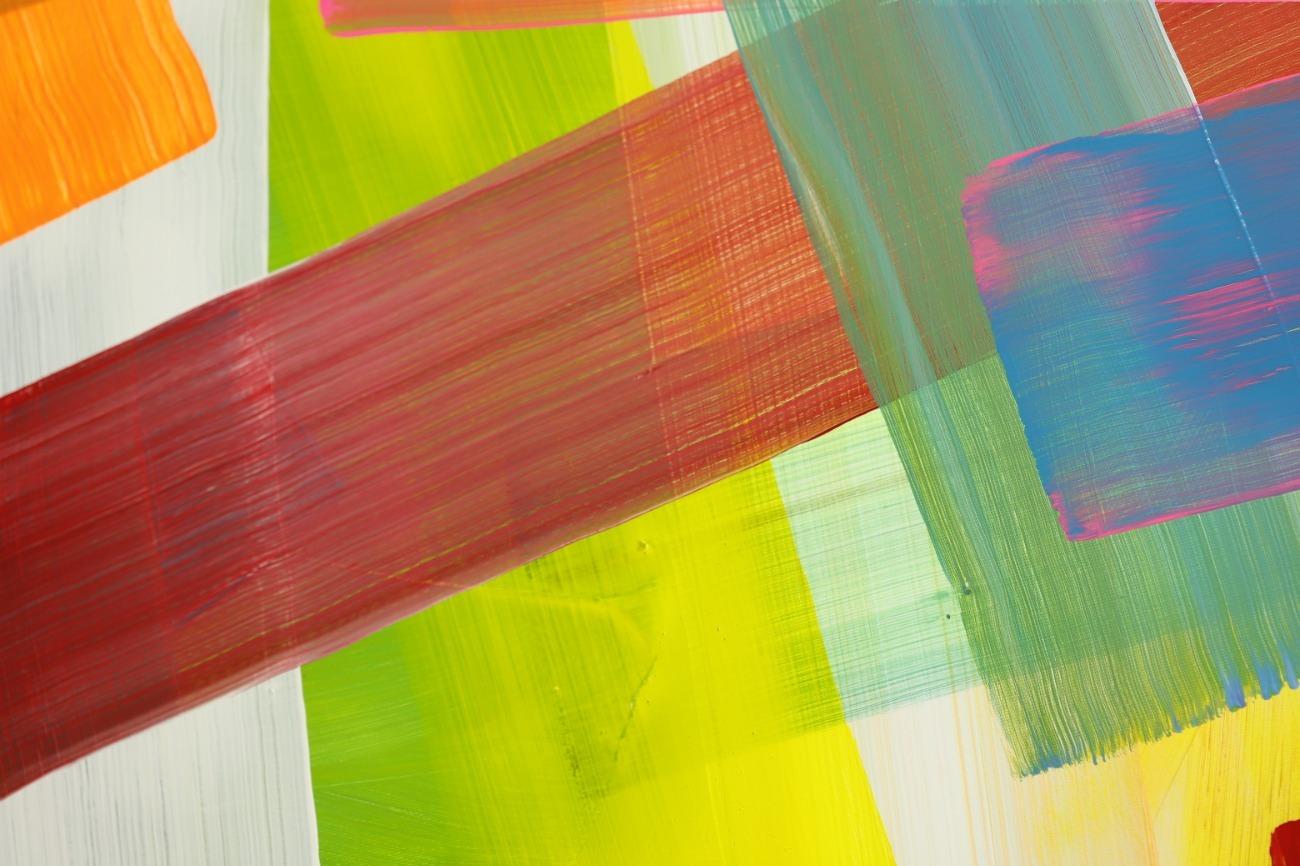 Abstraktes Gemälde auf Leinwand Gemälde Original abstrakt 150x150cm bunte Streifen Mischtechnik Modern Art handgefertigt gelb rot hellgrün Einzelstück in 150x150cm von Alex Zerr