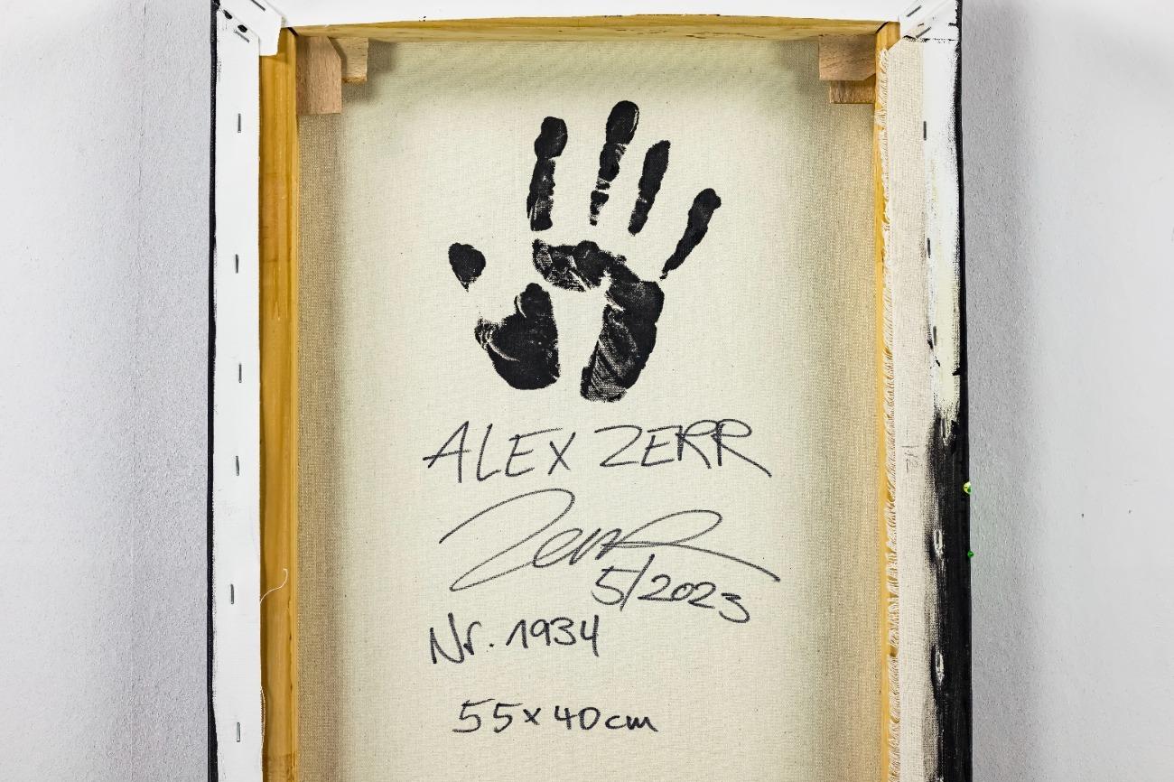 Jedes Gemälde auf xxl-art.de ist ein handgemaltes Original von Alex Zerr, handsigniert und mit seinem Handabdruck auf der Rückseite versehen. Dies garantiert die Authentizität und den Wert des Kunstwerks.