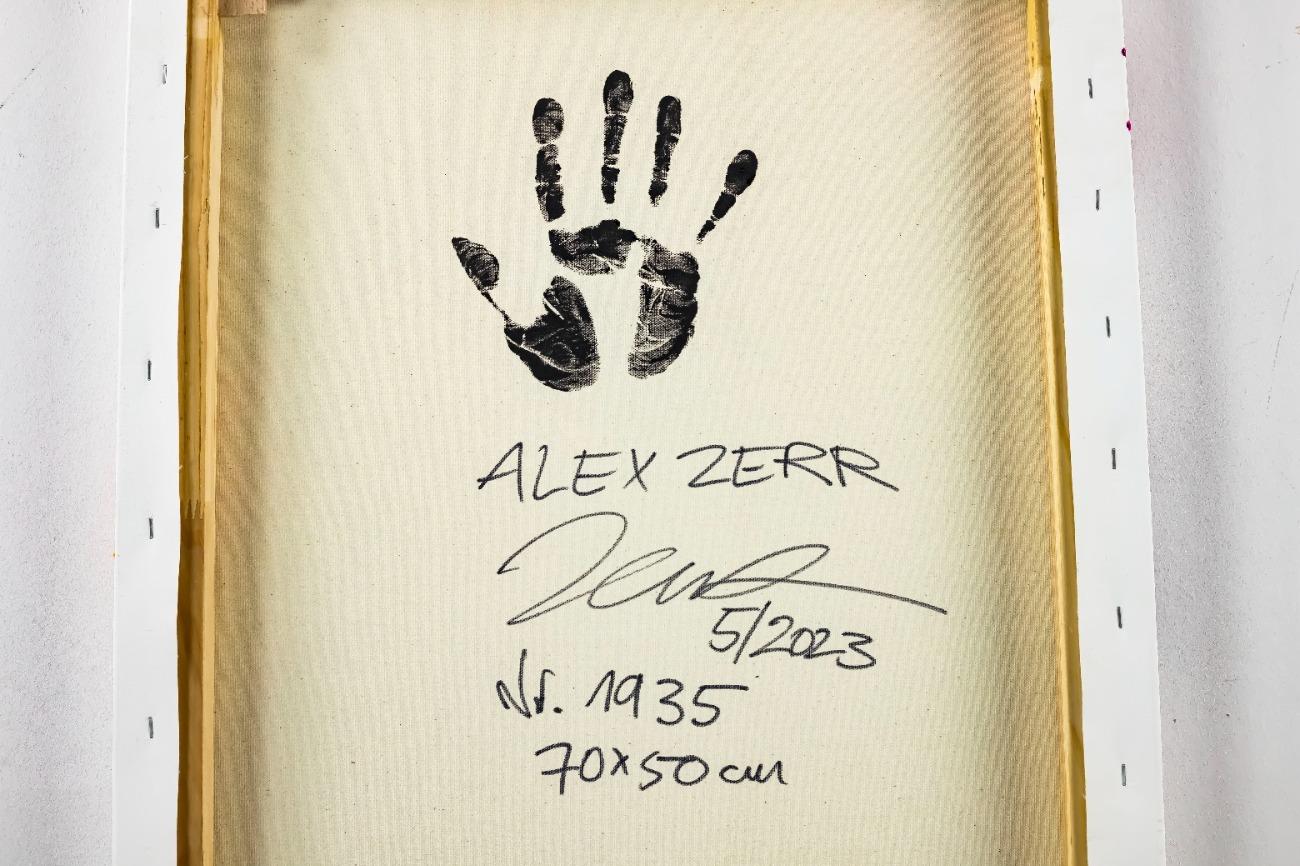 Eine einzigartige Vorderseite ist nicht alles: Bei fast allen Gemälden befindet sich auf der Rückseite der persönliche Handabdruck des Künstlers Alex Zerr.