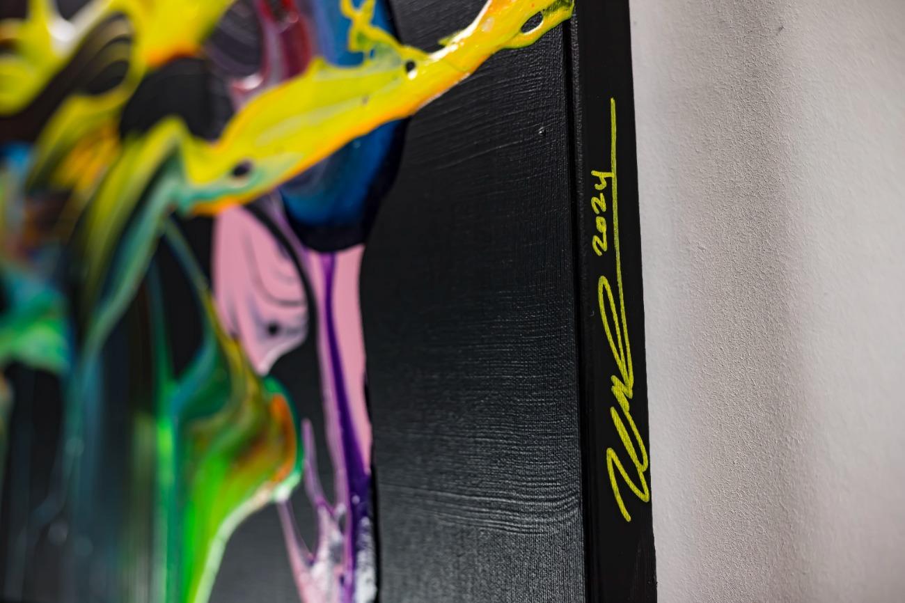 Dieses abstrakte Acrylbild ist ein handgemaltes Original vom Künstler Alex Zerr aus Bad Lisppringe und ist im Jahr 2024 in seinem Atelier entstanden. Das Bild hat eine Größe von 70x70cm und ist bereits auf einem hochwertigen und stabilem Rahmen aufgespannt. Dadurch kann das Bild nach der Lieferung direkt an die Wand gehängt werden und sofort in Ihrem Raum wirken. Alle Seiten des Gemäldes sind passend zum Motiv bemalt, so dass kein zusätzlicher Rahmen benötigt wird.
