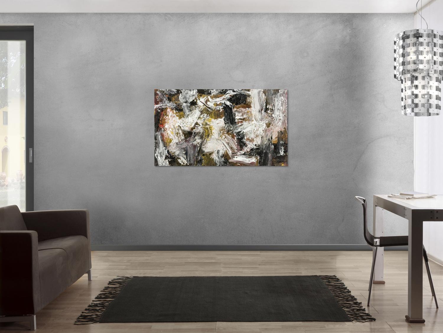 Abstraktes Gemälde auf Leinwand Gemälde Original abstrakt 75x130cm Action Painting Modern Art auf Leinwand Mischtechnik weiß schwarz anthrazit Einzelstück in 75x130cm von Alex Zerr