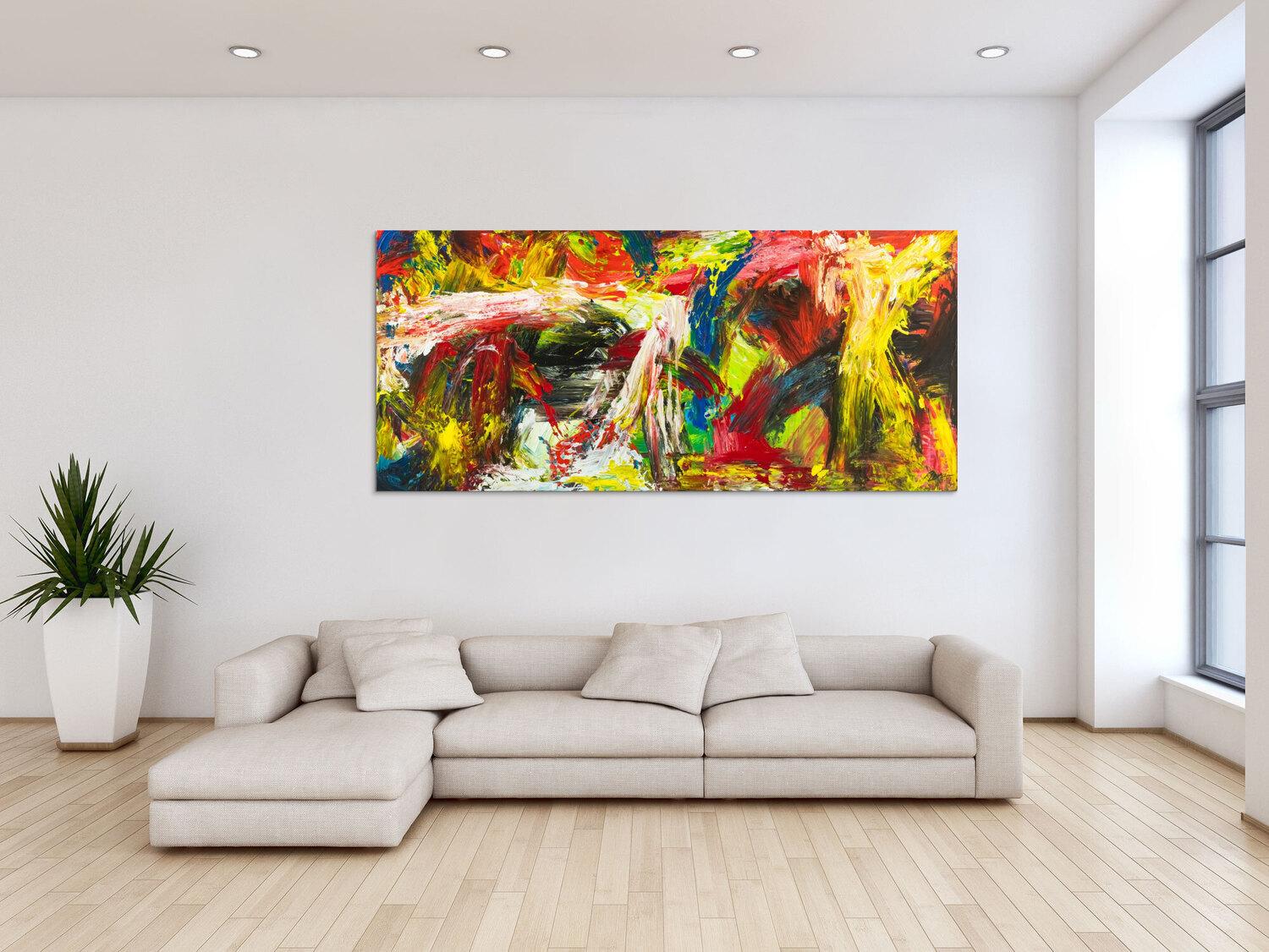 Abstraktes Gemälde auf Leinwand Gemälde Original abstrakt 90x200cm Action Painting grobe Struktur handgemalt Mischtechnik bunt rot gelb Unikat in 90x200cm von Alex Zerr