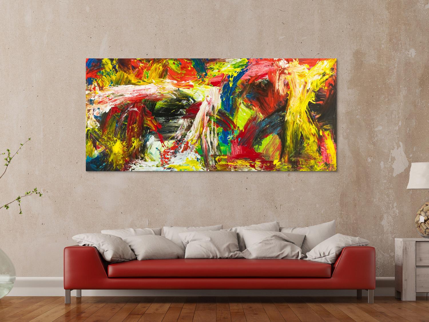 Gemälde Original abstrakt 90x200cm Action Painting grobe Struktur handgemalt Mischtechnik bunt rot gelb Unikat