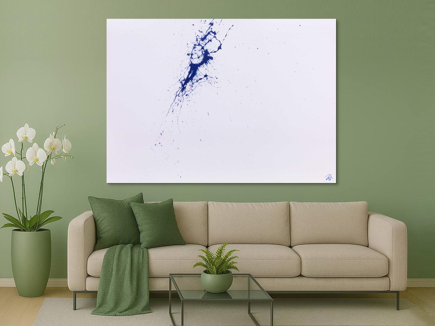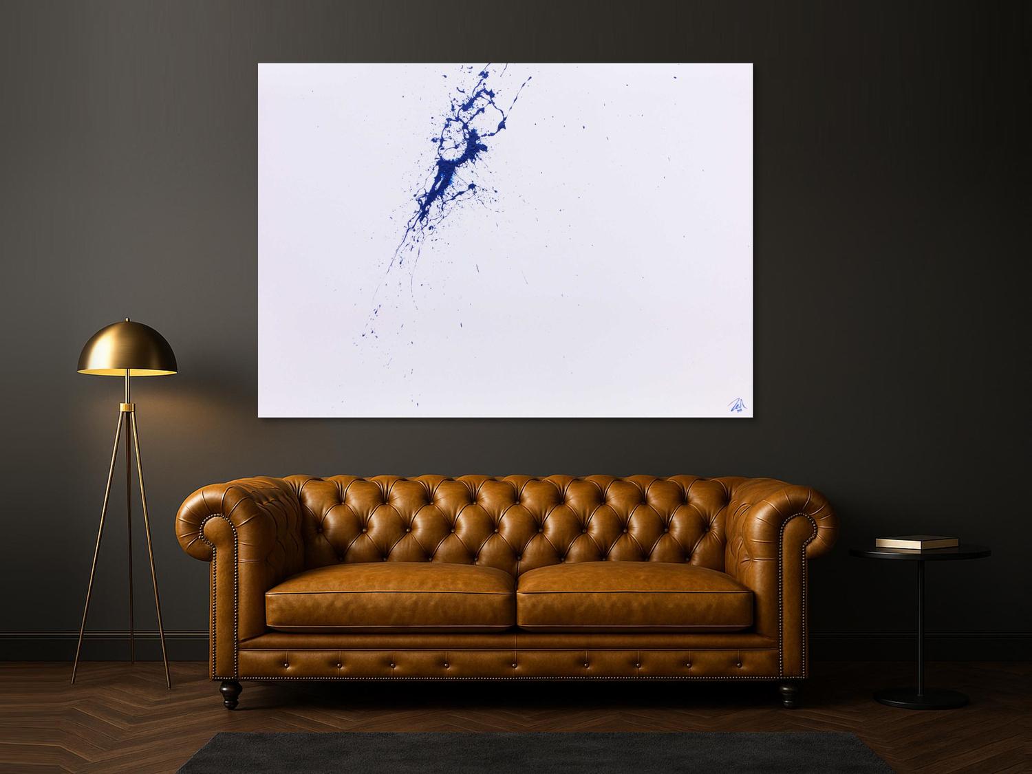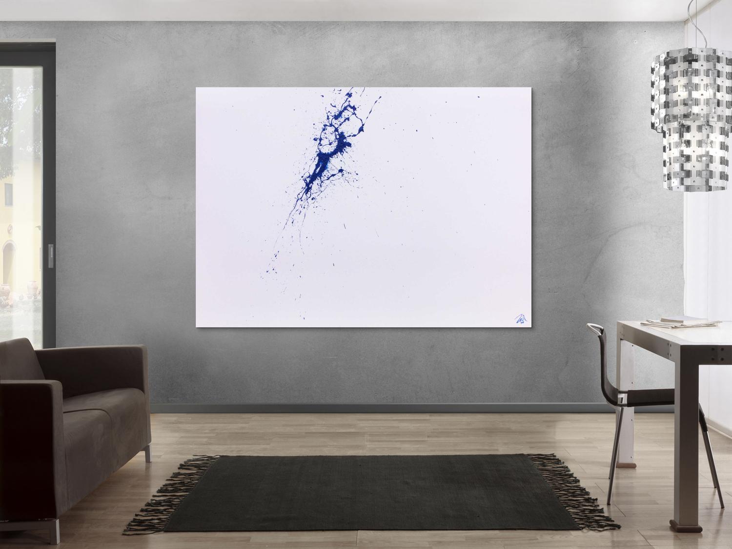 Abstraktes Gemälde auf Leinwand Minimalistisches Acrylbild Splash Art in weiß und blau in 150x200cm von Alex Zerr