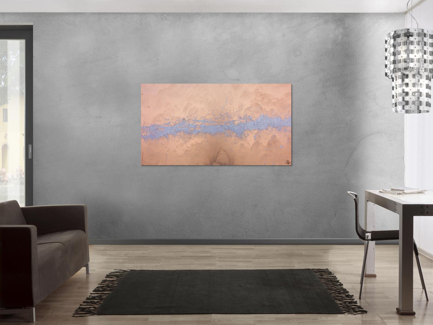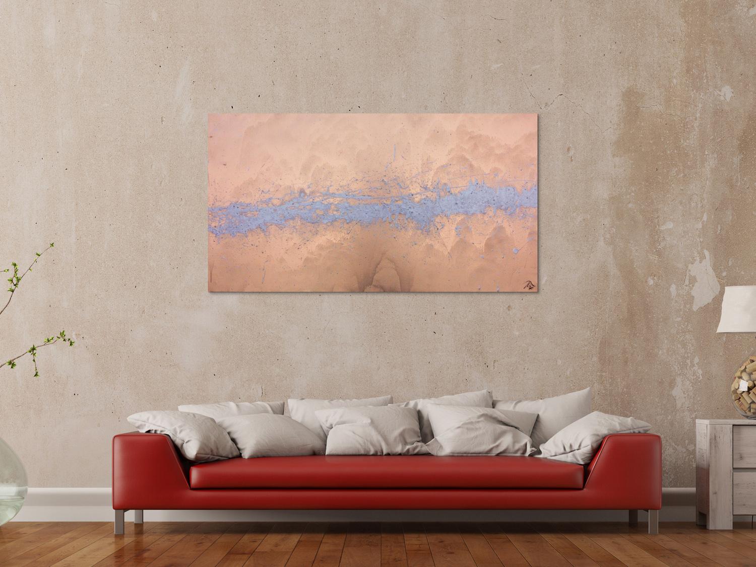 Dieses abstrakte Acrylbild ist ein handgemaltes Original vom Künstler Alex Zerr aus Bad Lisppringe und ist im Jahr 2015 in seinem Atelier entstanden. Das Bild hat eine Größe von 80x150cm und ist bereits auf einem hochwertigen und stabilem Rahmen aufgespannt. Dadurch kann das Bild nach der Lieferung direkt an die Wand gehängt werden und sofort in Ihrem Raum wirken. Alle Seiten des Gemäldes sind passend zum Motiv bemalt, so dass kein zusätzlicher Rahmen benötigt wird.