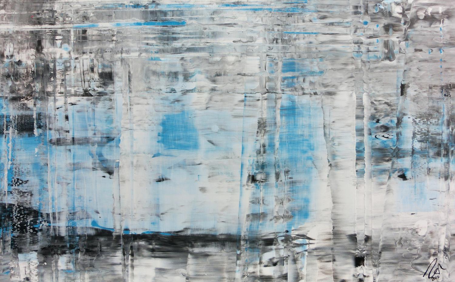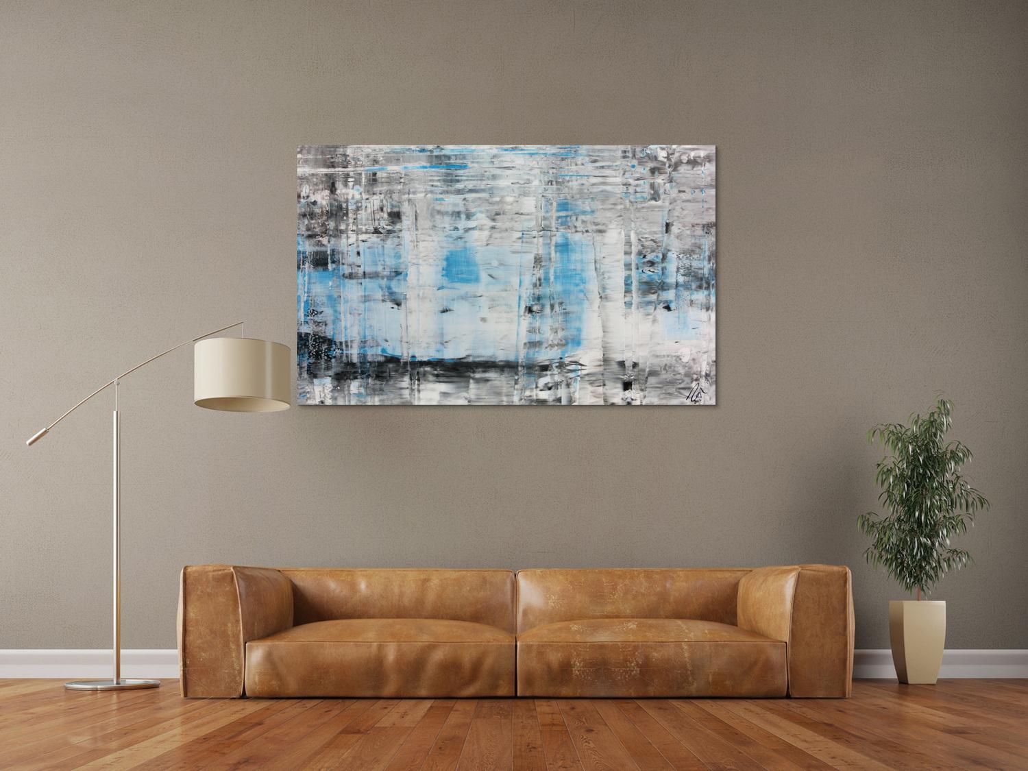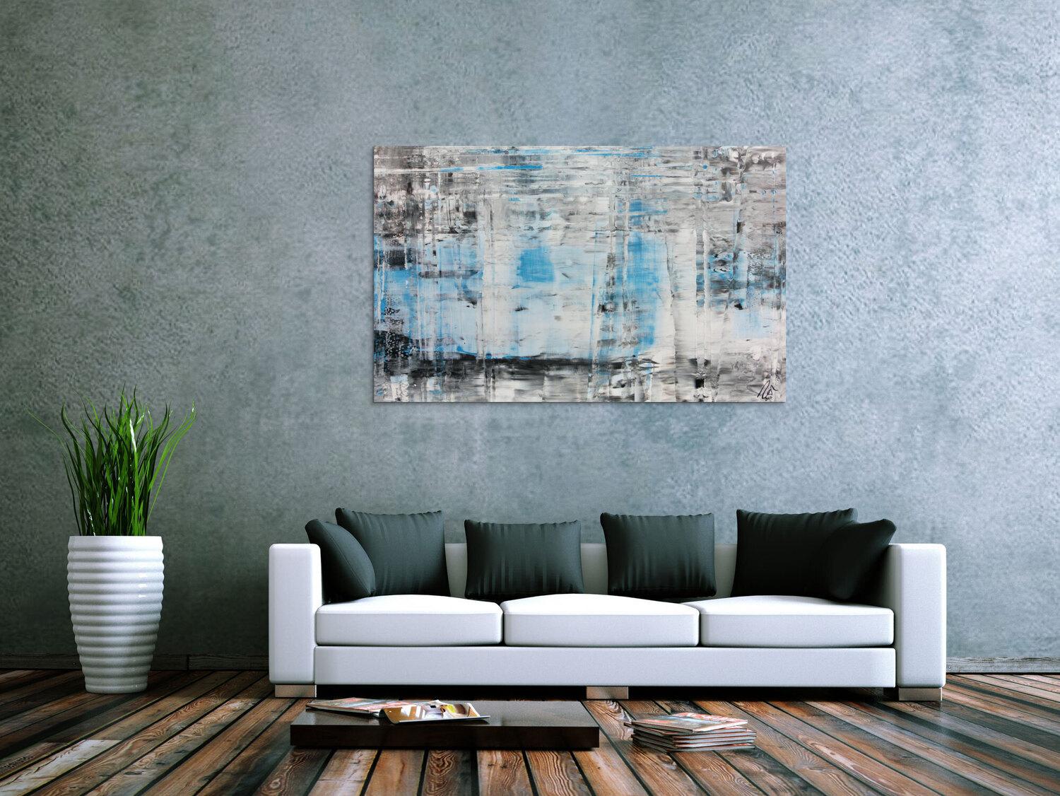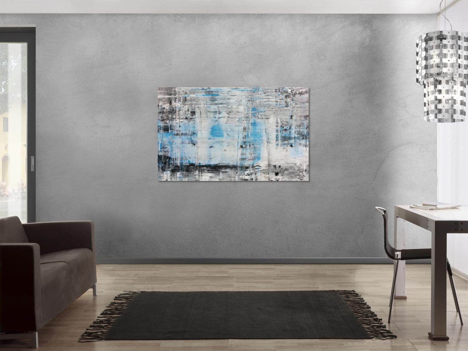 Abstraktes Gemälde auf Leinwand Modernes abstraktes Acrylbild in Spachteltechnik mit verschiedenen Grautönen viel weiß und türkis in 90x140cm von Alex Zerr
