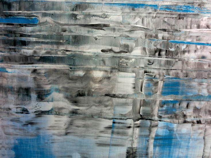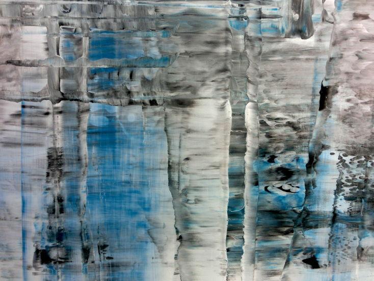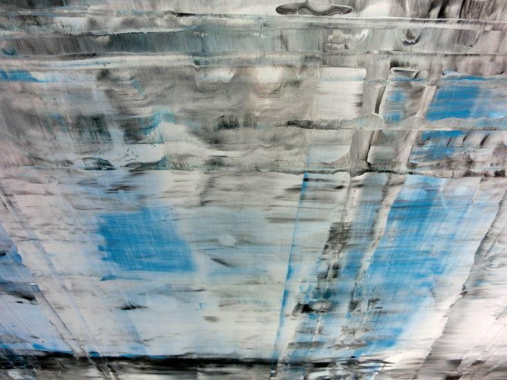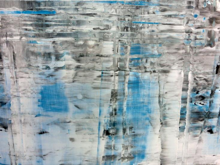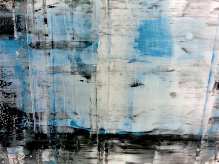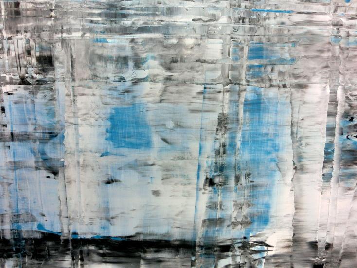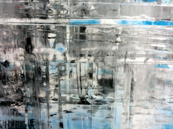 Modernes abstraktes Acrylbild in Spachteltechnik mit verschiedenen Grautönen viel weiß und türkis