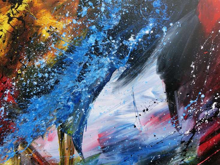 Dieses abstrakte Acrylbild ist ein handgemaltes Original vom Künstler Alex Zerr aus Bad Lisppringe und ist im Jahr 2015 in seinem Atelier entstanden. Das Bild hat eine Größe von 150x200cm und ist bereits auf einem hochwertigen und stabilem Rahmen aufgespannt. Dadurch kann das Bild nach der Lieferung direkt an die Wand gehängt werden und sofort in Ihrem Raum wirken. Alle Seiten des Gemäldes sind passend zum Motiv bemalt, so dass kein zusätzlicher Rahmen benötigt wird.