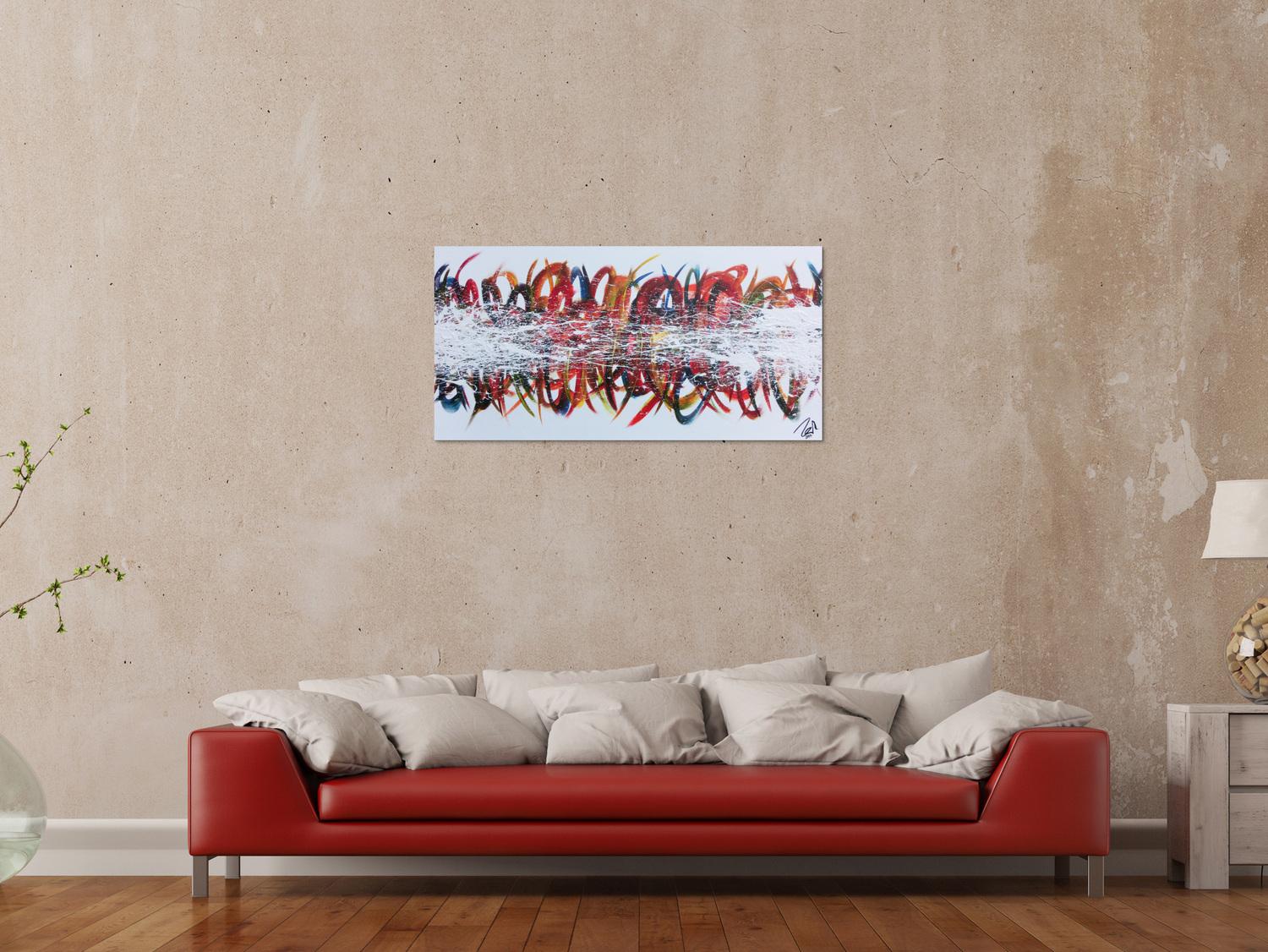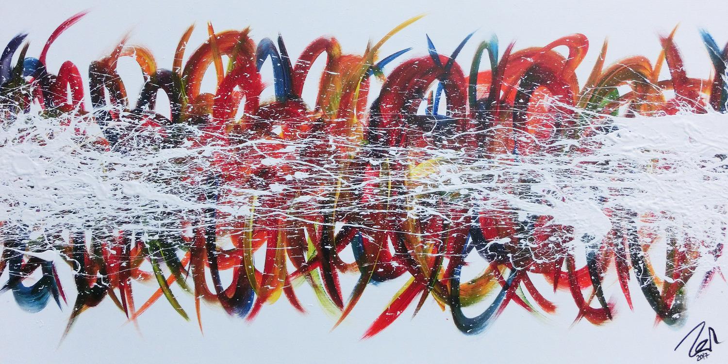 Dieses abstrakte Acrylbild ist ein handgemaltes Original vom Künstler Alex Zerr aus Bad Lisppringe und ist im Jahr 2017 in seinem Atelier entstanden. Das Bild hat eine Größe von 54x105cm und ist bereits auf einem hochwertigen und stabilem Rahmen aufgespannt. Dadurch kann das Bild nach der Lieferung direkt an die Wand gehängt werden und sofort in Ihrem Raum wirken. Alle Seiten des Gemäldes sind passend zum Motiv bemalt, so dass kein zusätzlicher Rahmen benötigt wird.