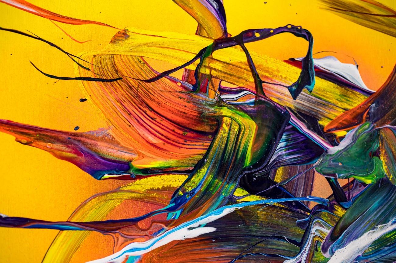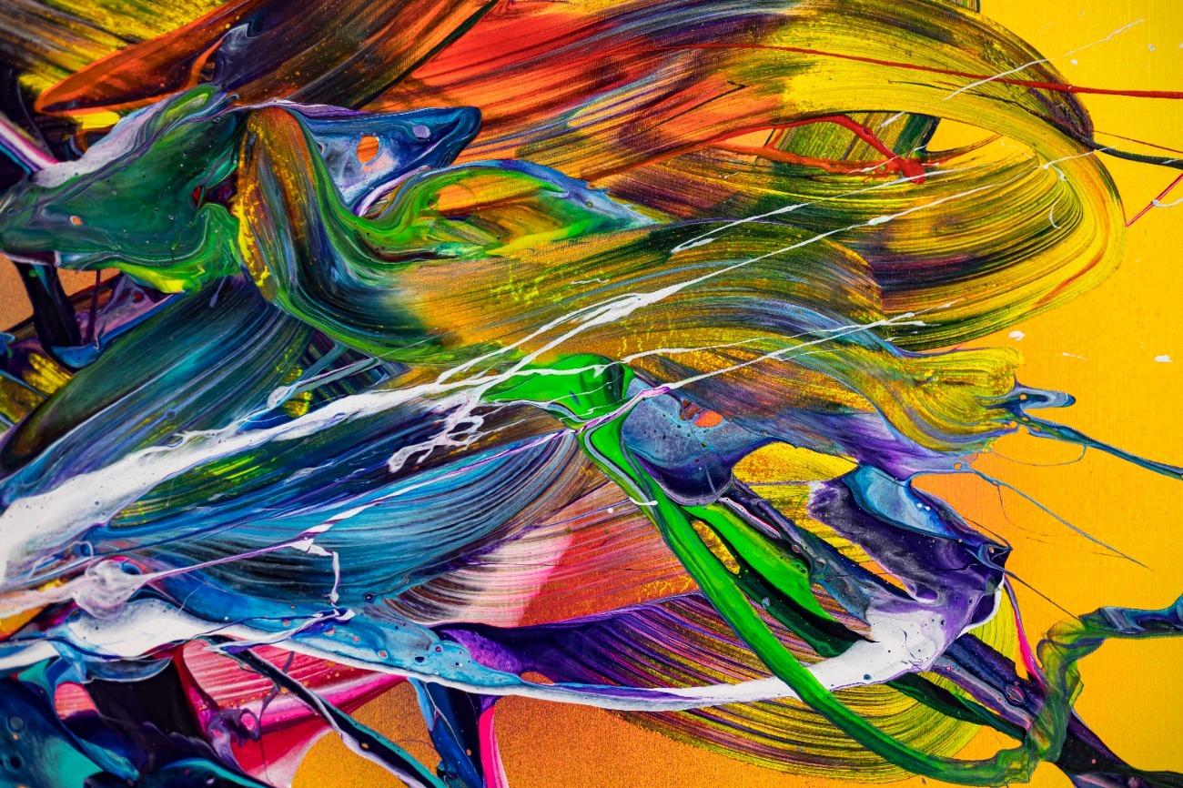 Original Gemälde abstrakt 100x150cm Action Painting Moderne Kunst handgefertigt Mischtechnik gelb bunt rot einzigartig