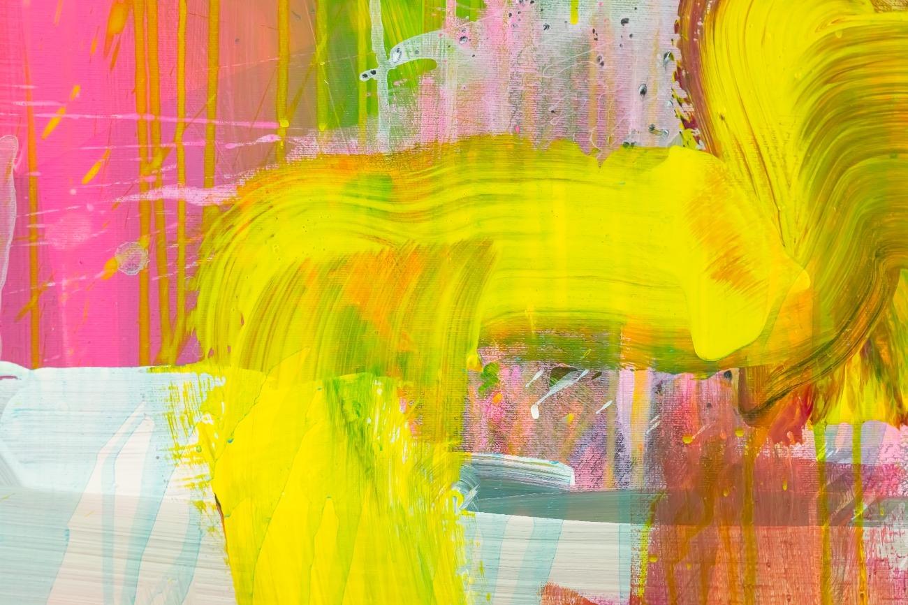 Acrylfarben und auf sehr großen XXL-Leinwänden, die meinem kreativen Prozess besonders viel Freiheit erlauben und oft zu