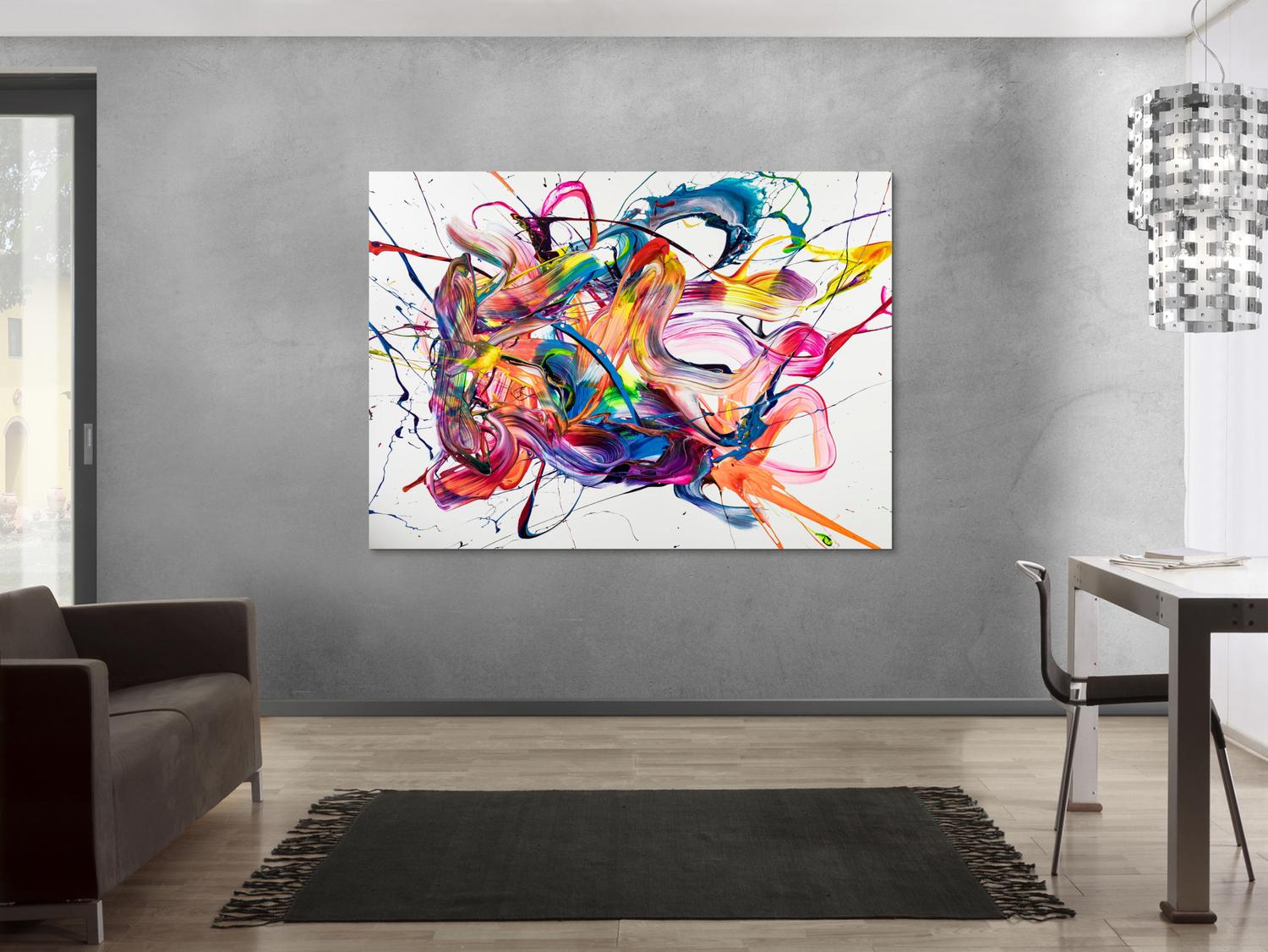 Original Gemälde abstrakt 130x180cm Action Painting zeitgenössisch handgemalt Mischtechnik weiß bunt rosa Unikat
