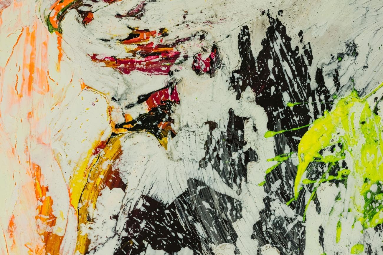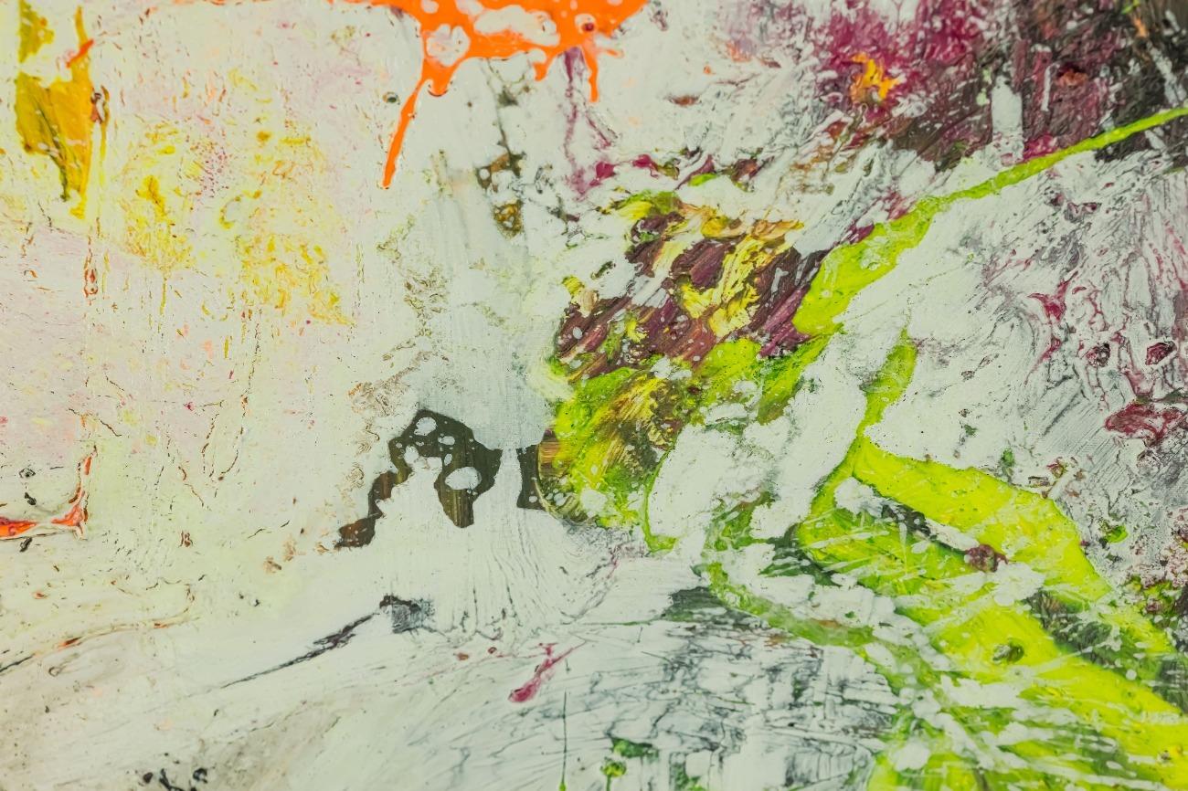 Abstraktes Gemälde auf Leinwand Original Gemälde abstrakt 150x100cm Action Painting Modern Art handgefertigt NEON grün gelb orange weiß hochwertig in 150x100cm von Alex Zerr
