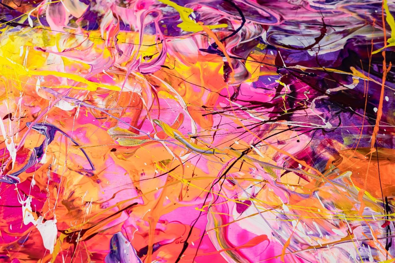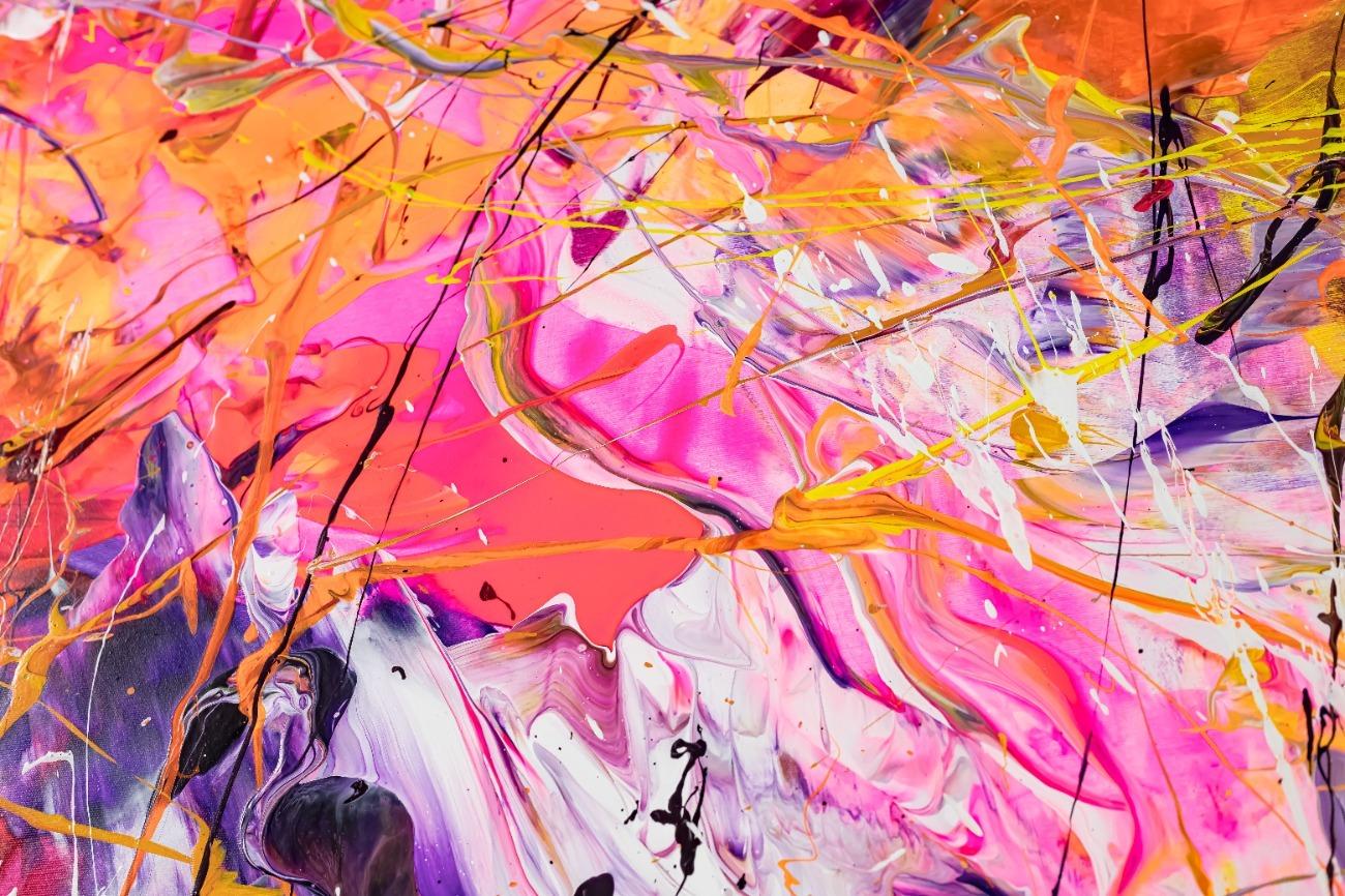 Original Gemälde abstrakt 180x150cm Minimalistisch expressionistisch auf Leinwand Action Painting rosa gelb orange hochwertig