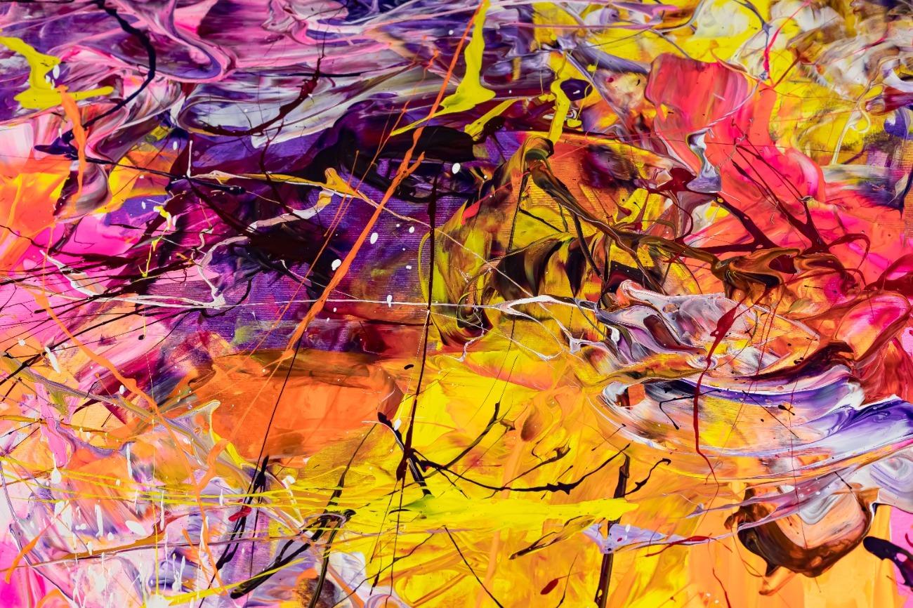 Abstraktes Gemälde auf Leinwand Original Gemälde abstrakt 180x150cm Minimalistisch expressionistisch auf Leinwand Action Painting rosa gelb orange hochwertig in 180x150cm von Alex Zerr