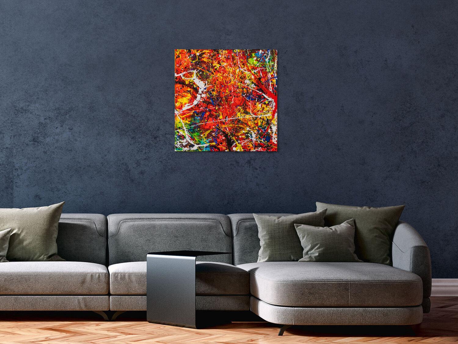 Original Gemälde abstrakt 60x60cm Action Painting zeitgenössisch auf Leinwand Splash Art rot orange bunt Einzelstück