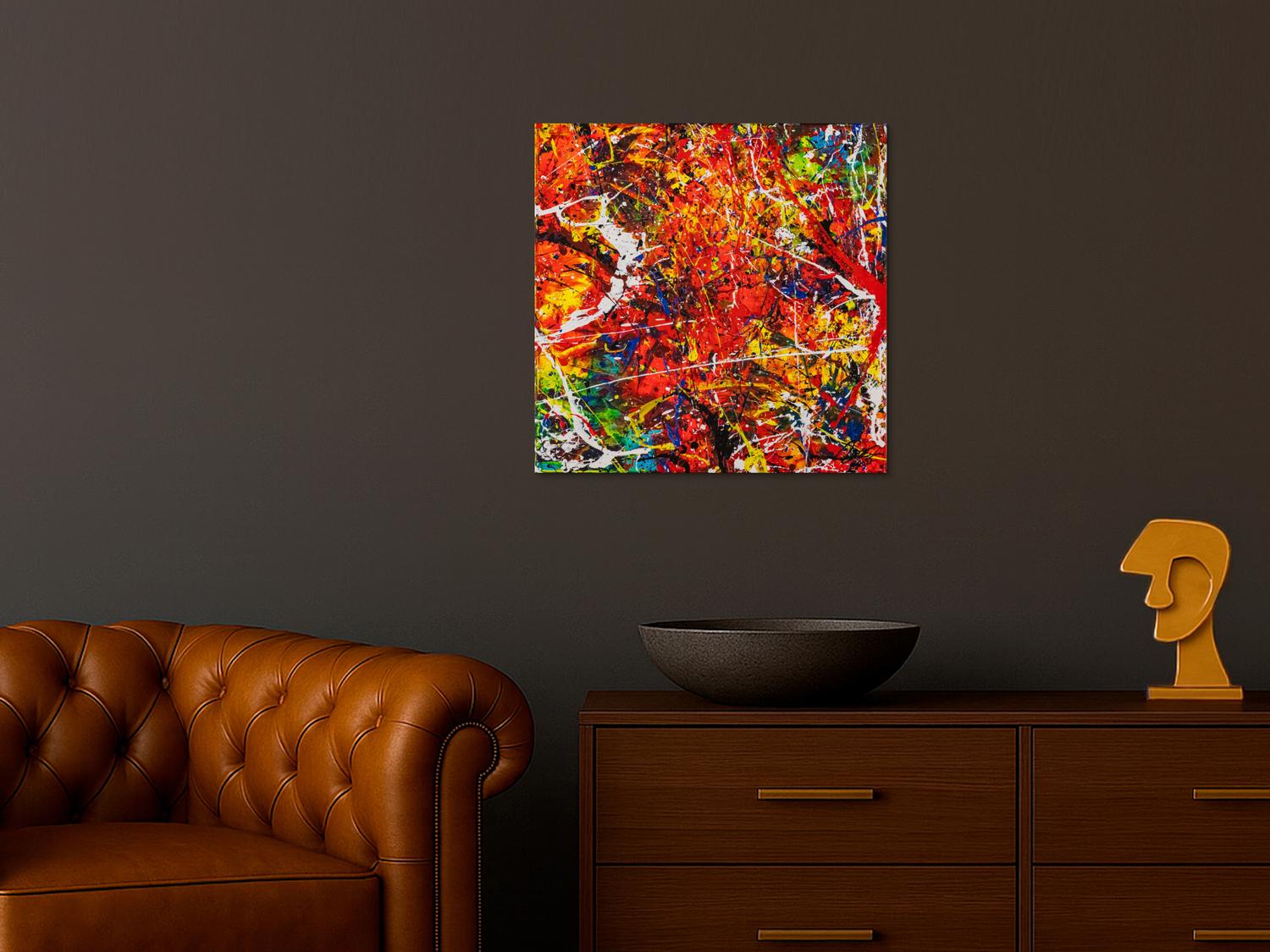 Abstraktes Gemälde auf Leinwand Original Gemälde abstrakt 60x60cm Action Painting zeitgenössisch auf Leinwand Splash Art rot orange bunt Einzelstück in 60x60cm von Alex Zerr