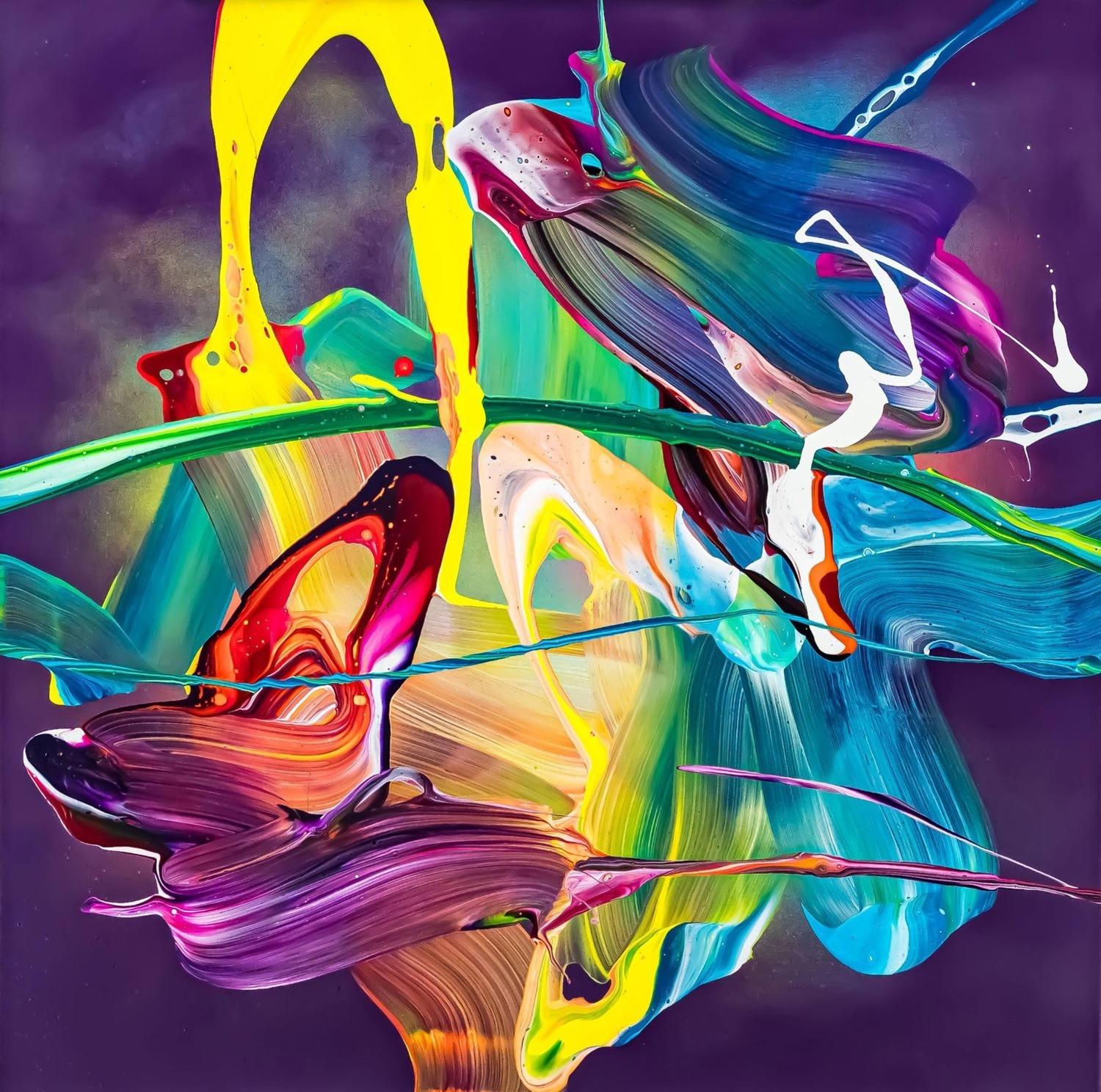 Original Gemälde abstrakt 70x70cm Action Painting zeitgenössisch handgemalt Mischtechnik violett blau gelb hochwertig