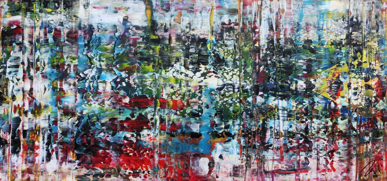 Dieses abstrakte Acrylbild ist ein handgemaltes Original vom Künstler Alex Zerr aus Bad Lisppringe und ist im Jahr 2016 in seinem Atelier entstanden. Das Bild hat eine Größe von 75x160cm und ist bereits auf einem hochwertigen und stabilem Rahmen aufgespannt. Dadurch kann das Bild nach der Lieferung direkt an die Wand gehängt werden und sofort in Ihrem Raum wirken. Alle Seiten des Gemäldes sind passend zum Motiv bemalt, so dass kein zusätzlicher Rahmen benötigt wird.