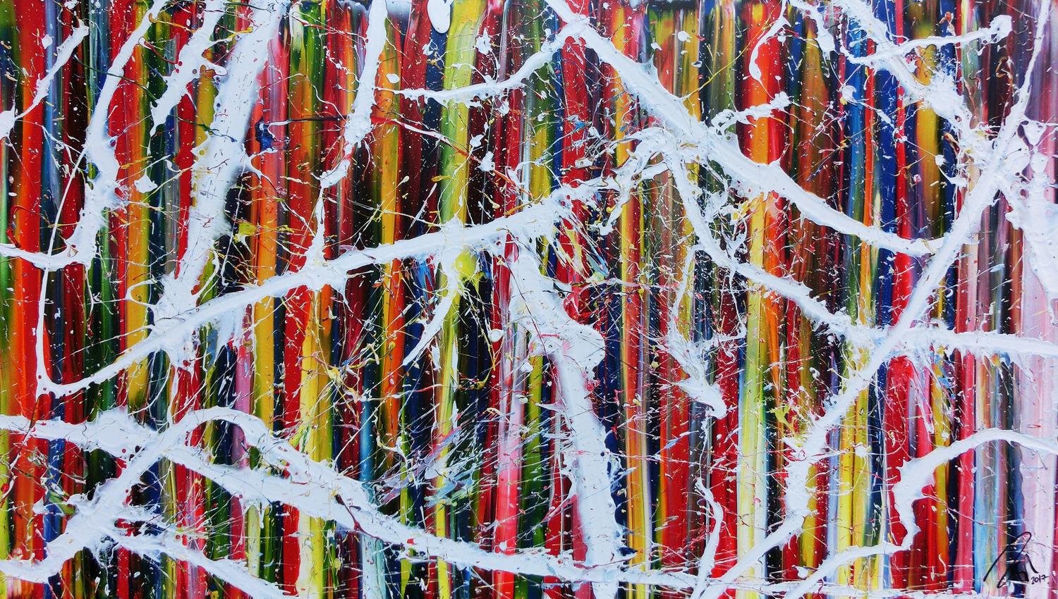 Abstraktes Gemälde auf Leinwand Sehr buntes abstraktes Acrylgemälde modernes Bild bunte Streifen Action Painting in 100x180cm von Alex Zerr