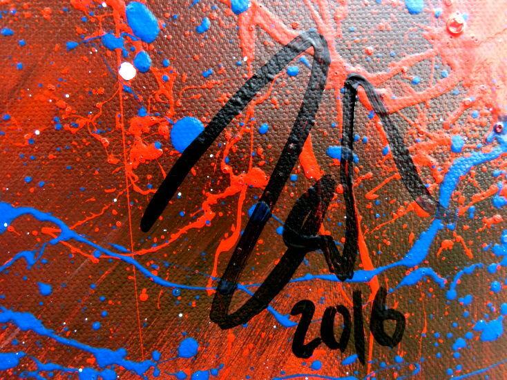 Dieses abstrakte Acrylbild ist ein handgemaltes Original vom Künstler Alex Zerr aus Bad Lisppringe und ist im Jahr 2016 in seinem Atelier entstanden. Das Bild hat eine Größe von 100x140cm und ist bereits auf einem hochwertigen und stabilem Rahmen aufgespannt. Dadurch kann das Bild nach der Lieferung direkt an die Wand gehängt werden und sofort in Ihrem Raum wirken. Alle Seiten des Gemäldes sind passend zum Motiv bemalt, so dass kein zusätzlicher Rahmen benötigt wird.